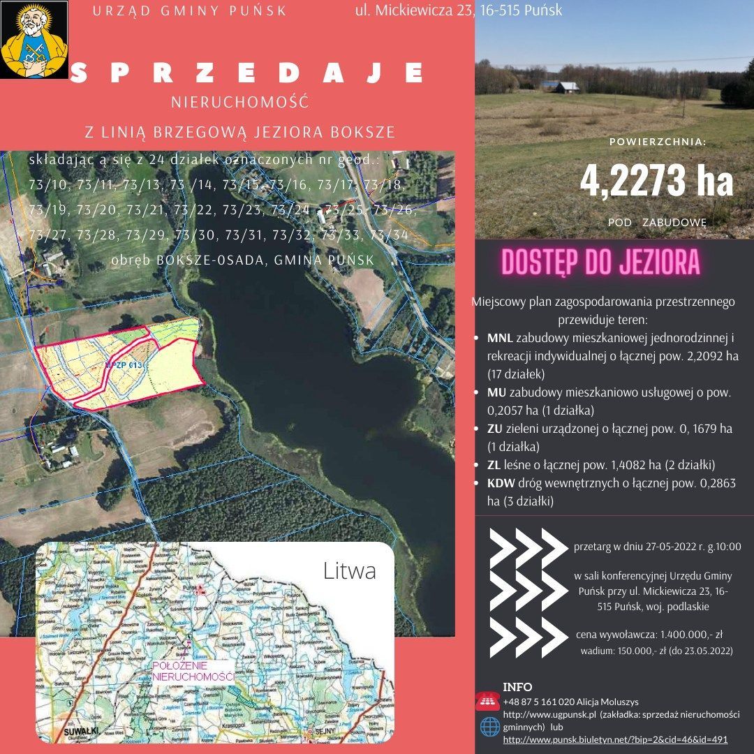 To atrakcyjne nieruchomości niezabudowane położone przy jeziorze Boksze z linią brzegową ok. 103 mb. Dojazd drogą asfaltową, możliwość przyłączenia do sieci elektroenergetycznej i wodociągowej.