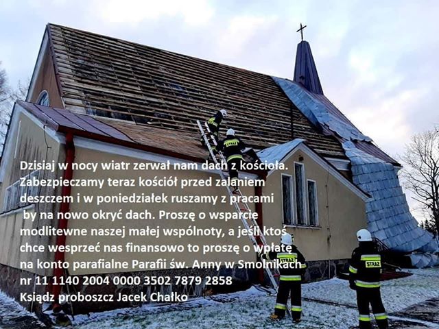 Z kościoła w Smolnikach wiatr zerwał dach: