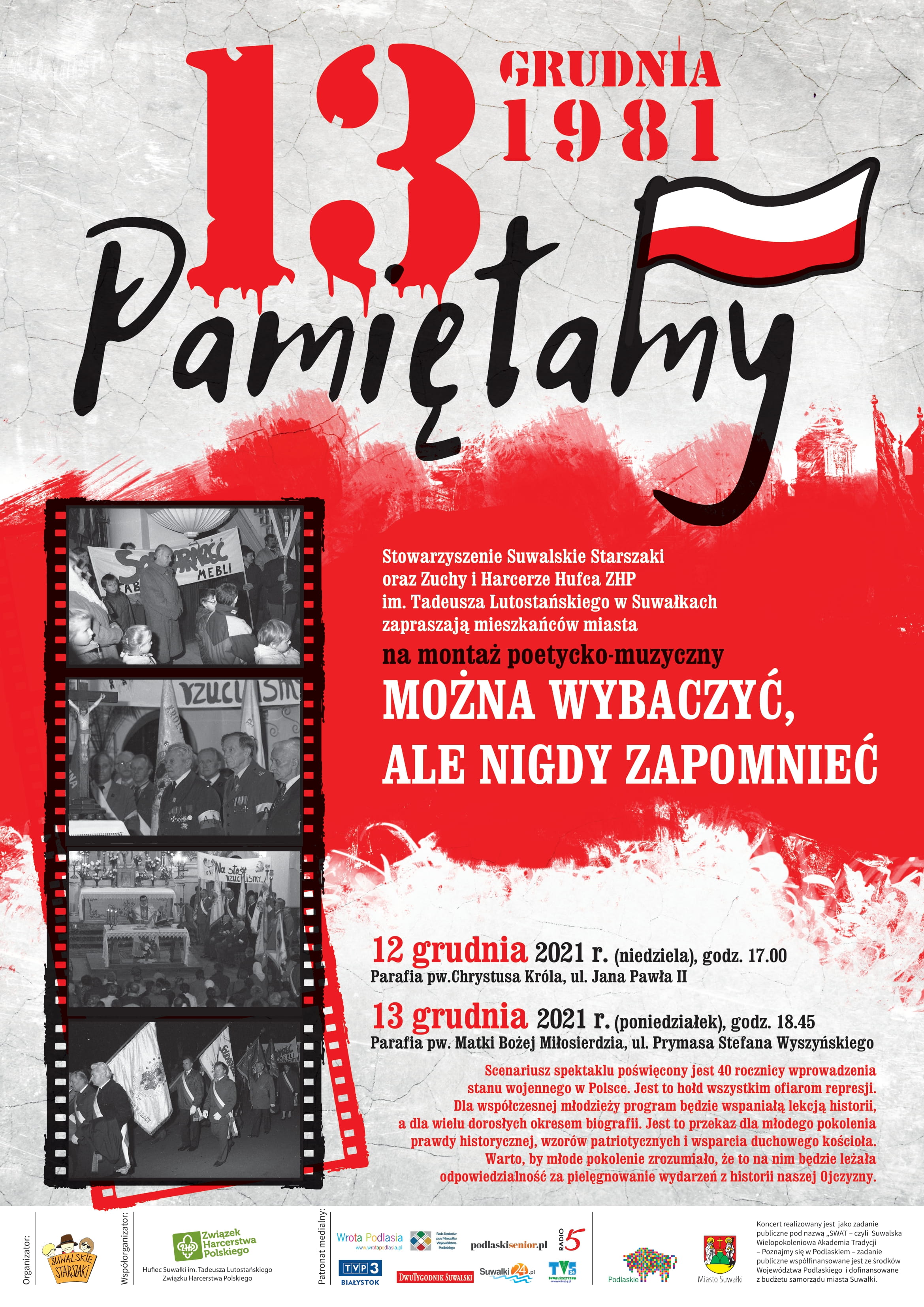 Stowarzyszenie Suwalskie Starszaki oraz Zuchy i Harcerze Hufca ZHP im. Tadeusza Lutostańskiego w Suwałkach zapraszają na montaż poetycko – muzyczny „Można wybaczyć, ale nigdy zapomnieć”.