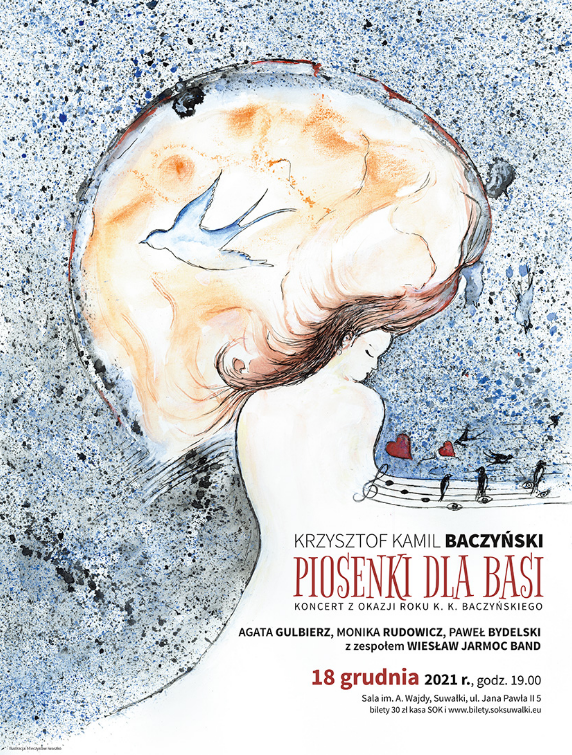 Koncert Krzysztof Kamil Baczyński. Piosenki dla Basi jest kolejnym autorskim projektem muzycznym Wiesława Jarmoca. W wykonaniu suwalskich artystów: Agaty Gulbierz, Moniki Rudowicz i Pawła Bydelskiego, usłyszymy wybrane utwory poety. Mimo mrocznego czasu, w którym przyszło im żyć, wiele miejsca w swej twórczości Baczyński poświęcił Barbarze, “Basi”, “Basieńce”, “Ukochanej żonie”- podobnych zwrotów w wierszach Baczyńskiego odnajdziemy wiele. Przejmująca poezja Krzysztofa Kamila Baczyńskiego jest świadectwem wielkiej miłości. W cieniu wciąż zagrażającej śmierci, w centrum świata ogarniętego wojną nadal stała jego żona – Barbara.