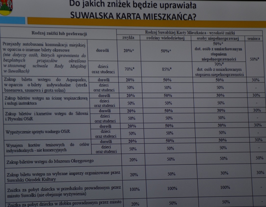 Władze Suwałk zamierzają objąć mieszkańców programem ulg w korzystaniu z komunikacji miejskiej oraz zakupie wejściówek do SOK-u, Muzeum Okręgowego, na obiekty OSiR-u (aquapark, korty tenisowe, ścianka wspinaczkowa).