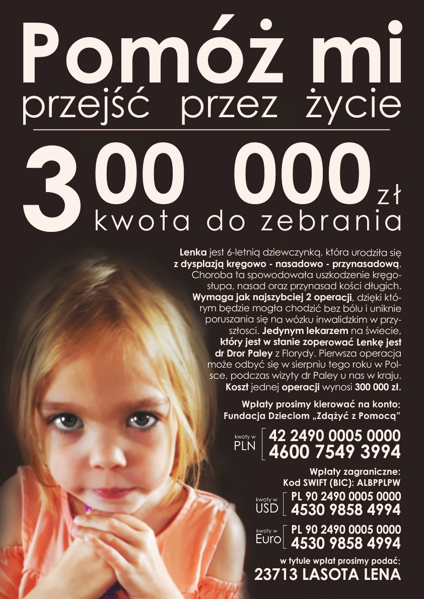 W pubie-restauracji przy ul. Noniewicza 16 sierpnia o godz.19 rozpocznie siÄ™ muzyczna impreza, która poprowadzi DJ Karolek. Każdy chÄ™tny za dowolnÄ… kwotÄ™ bÄ™dzie mógÅ‚ zamówić swój ulubiony utwór, a pieniÄ…dze zostanÄ… przeznaczone na pomoc dla Lenki.