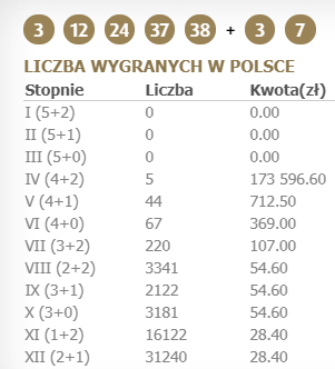 W Polsce odnotowanych zostało 5 wygranych IV stopnia po 173,5 tys. zł.