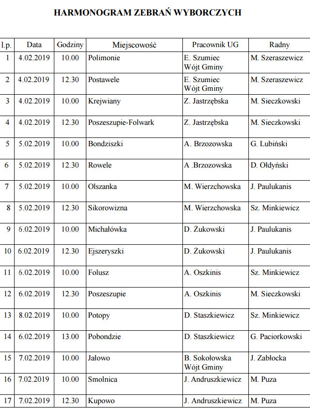 Natomiast w gminie Rutka-Tartak wybory rozpocznÄ… siÄ™ 4 lutego i potrwajÄ… tydzieÅ„. Najpierw swojego przedstawiciela, który m.in. bÄ™dzie braÅ‚ udziaÅ‚ w gminnych sesjach, wybiorÄ… mieszkaÅ„cy miejsowoÅ›ci Polimonie, Postawele, Krejwiany i Poszeszupie – Folwark.