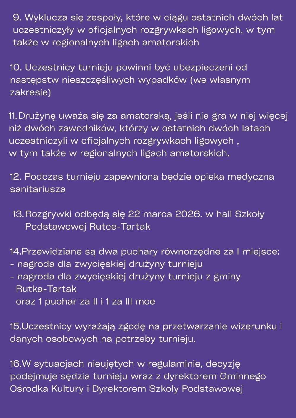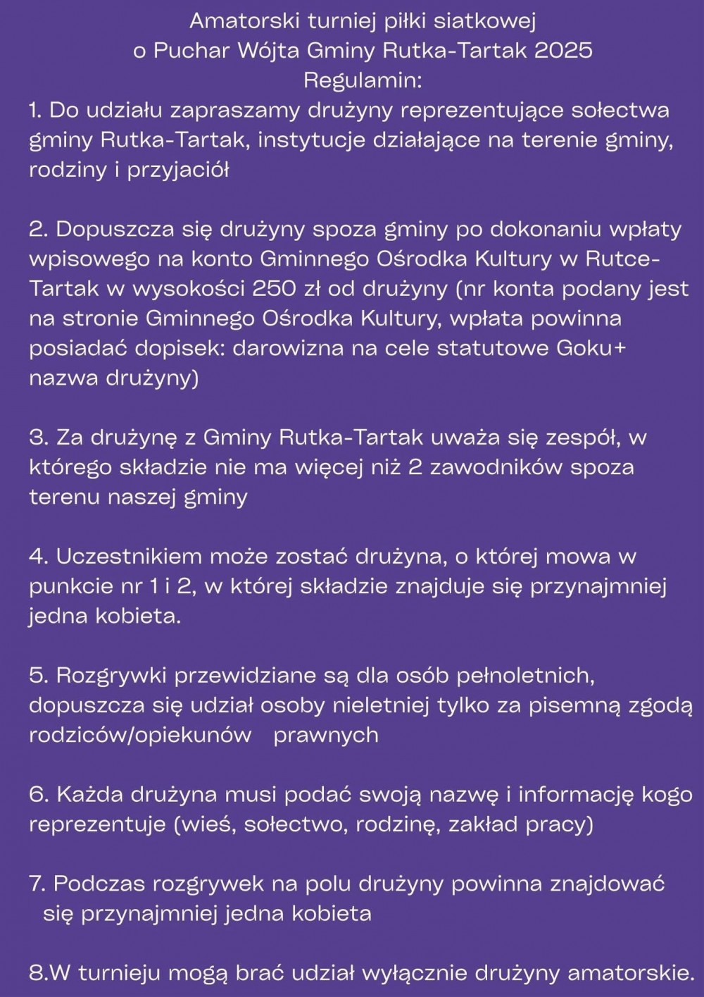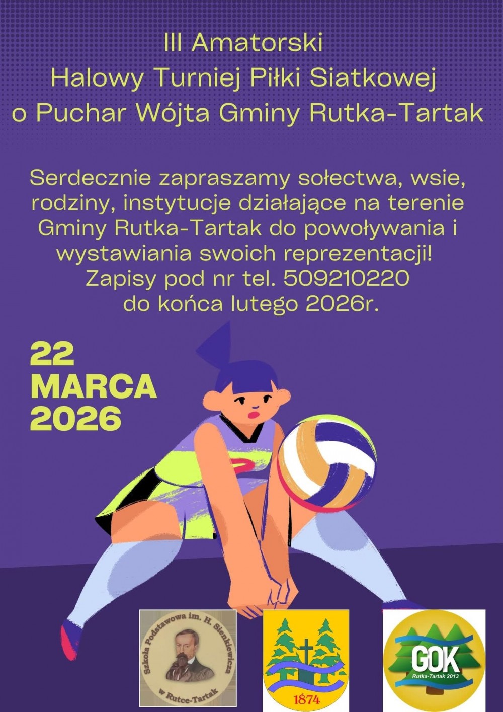 Gminny Ośrodek Kultury, Urząd Gminy oraz Szkoła Podstawowa im. H. Sienkiewicza w Rutce-Tartak zapraszają do udziału w III Amatorskim Halowym Turnieju Piłki Siatkowej o Puchar Wójta Gminy Rutka-Tartak.