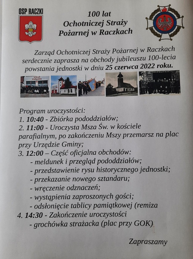 Zarząd Ochotniczej Straży Pożarnej w Raczkach serdecznie zaprasza na obchody jubileuszu 100-lecia powstania jednostki.
