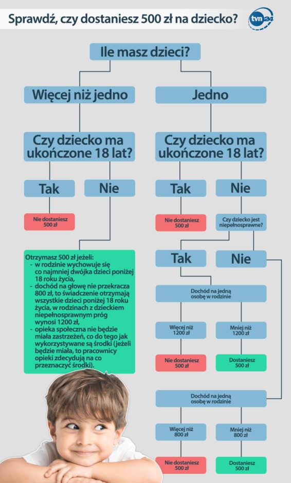 Przypomnijmy, projekt ustawy o pomocy paÅ„stwa w wychowywaniu dzieci wprowadza Å›wiadczenie wychowawcze 500 zÅ‚ miesiÄ™cznie na drugie i kolejne dziecko, a w przypadku rodzin, których dochód nie przekracza 800 zÅ‚ brutto na osobÄ™ w rodzinie lub 1200 zÅ‚ brutto w przypadku rodzin z dzieckiem niepeÅ‚nosprawnym - również na pierwsze dziecko. Åšwiadczenie bÄ™dzie wypÅ‚acane do ukoÅ„czenia przez dziecko 18 lat.