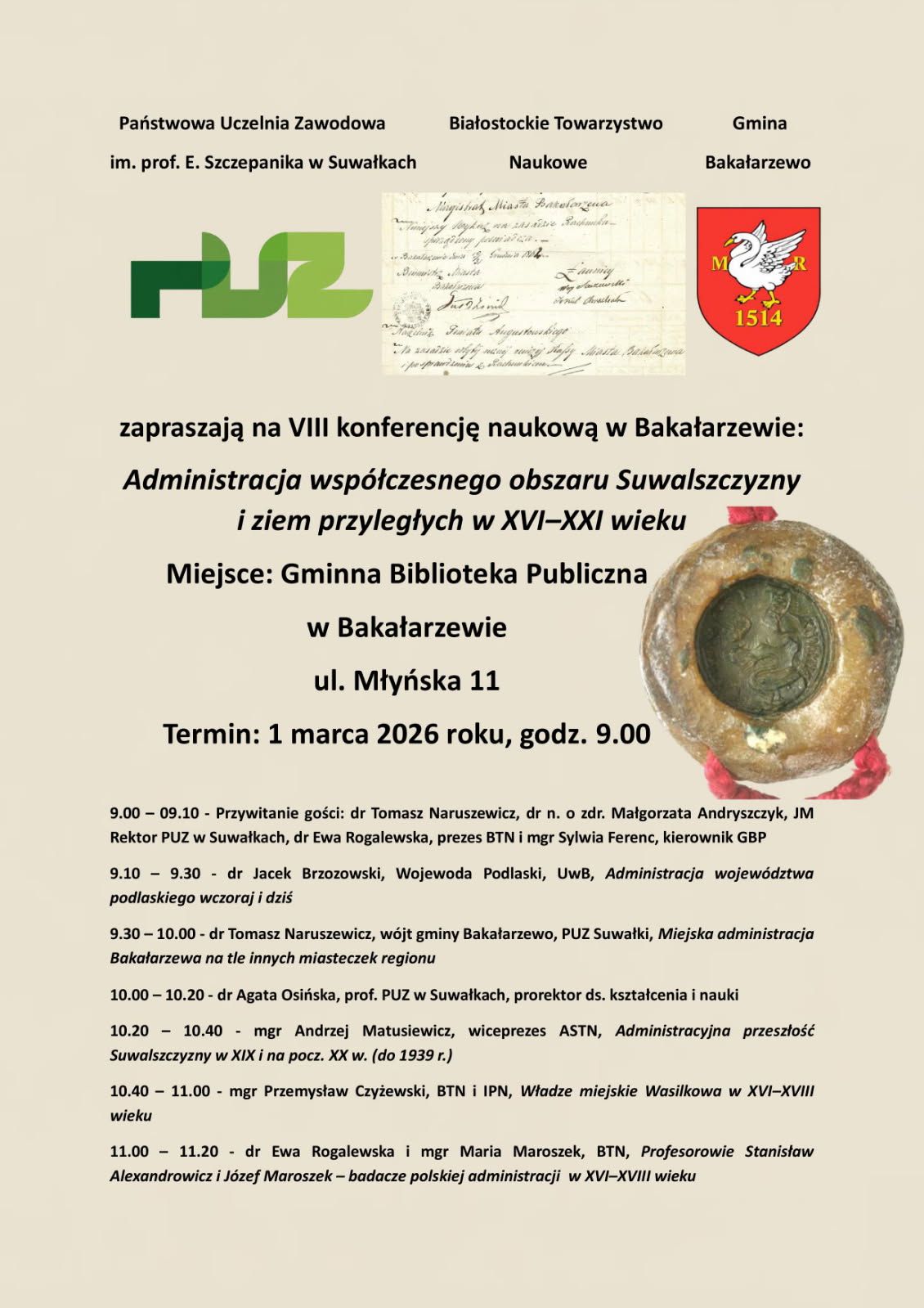 Państwowa Uczelnia Zawodowa im. prof. E. Szczepanika w Suwałkach, Białostockie Towarzystwo Naukowe oraz Gmina Bakałarzewo serdecznie zapraszają na na VIII konferencję naukową w Bakałarzewie: Administracja współczesnego obszaru Suwalszczyzny i ziem przyległych w XVI–XXI wieku.