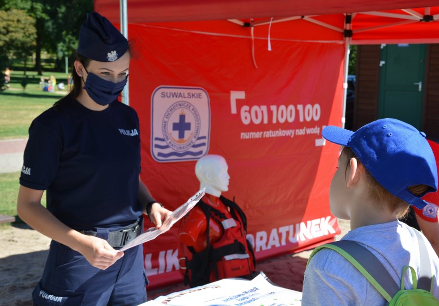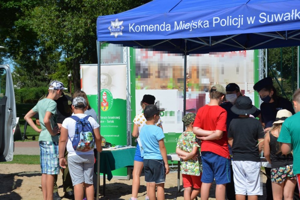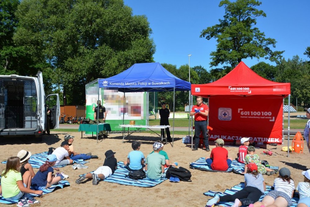 Policjanci oraz pracownicy z Komendy Miejskiej w Policji w Suwałkach, wspólnie z przedstawicielami innych instytucji, działającymi na rzecz bezpieczeństwa, spotykają się z dziećmi i przypominają o zasadach bezpieczeństwa w czasie letniego wypoczynku.