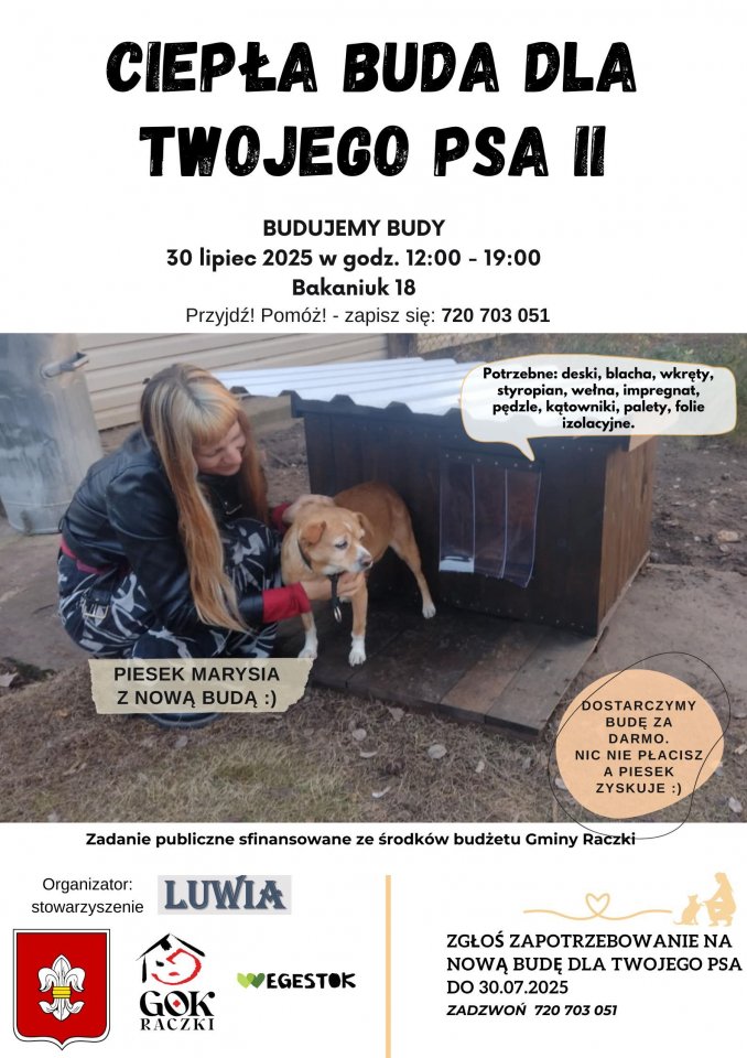 Stowarzyszenie LUWIA, Urząd Gminy Raczki oraz Gminny Ośrodek Kultury w Raczkach zapraszają do wspólnego budowania bud dla psów.
