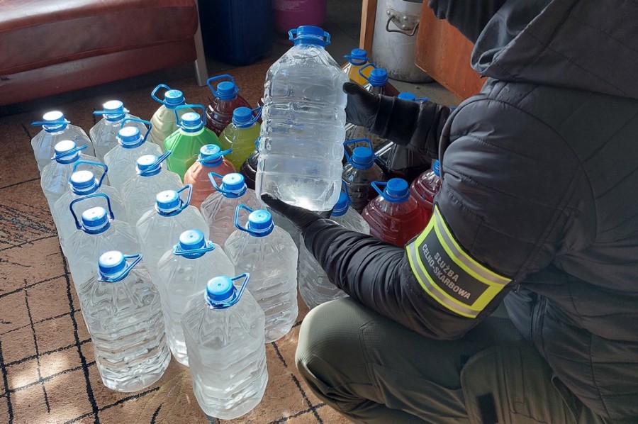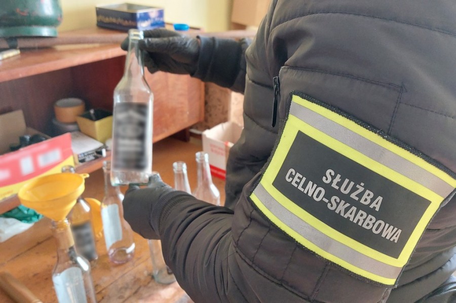 Funkcjonariusze SÅ‚użby Celno-Skarbowej skontrolowali posesjÄ™ w gminie Czarna BiaÅ‚ostocka. Na miejscu mundurowi zaskoczyli 42-letniego mężczyznÄ™, który w jednym z pomieszczeÅ„ rozlewaÅ‚ do butelek nielegalny alkohol. Podczas przeszukania gospodarstwa zabezpieczono 202,5 l bimbru o mocy od 20 do 50 procent.