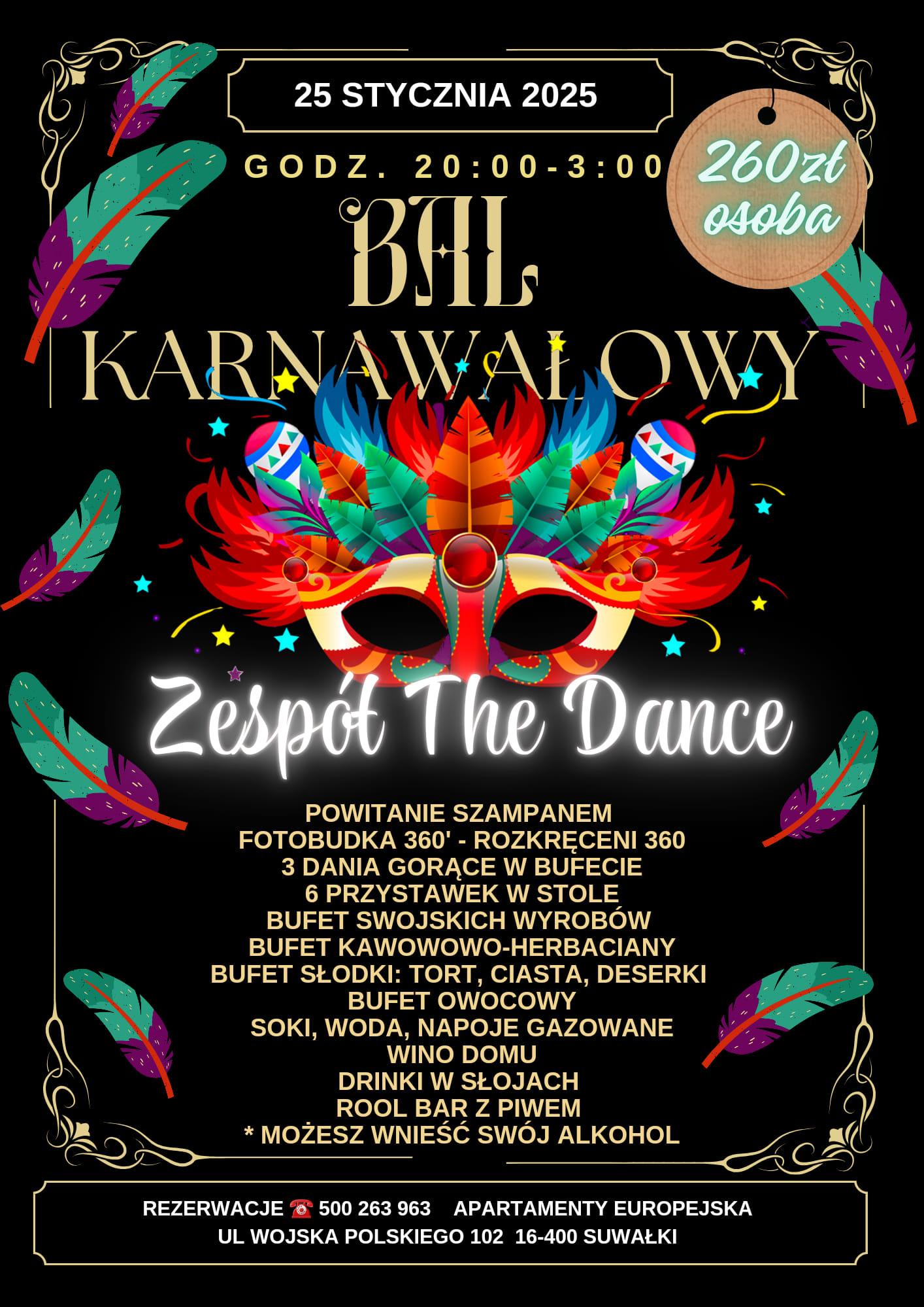 Obiekt restauracyjno-noclegowy Apartamenty Europejska przy ul. Wojska Polskiego w Suwałkach w najbliższą sobotę, 25 stycznia zaprasza na Bal Karnawałowy, a 15 lutego na Bal Walentynkowy.