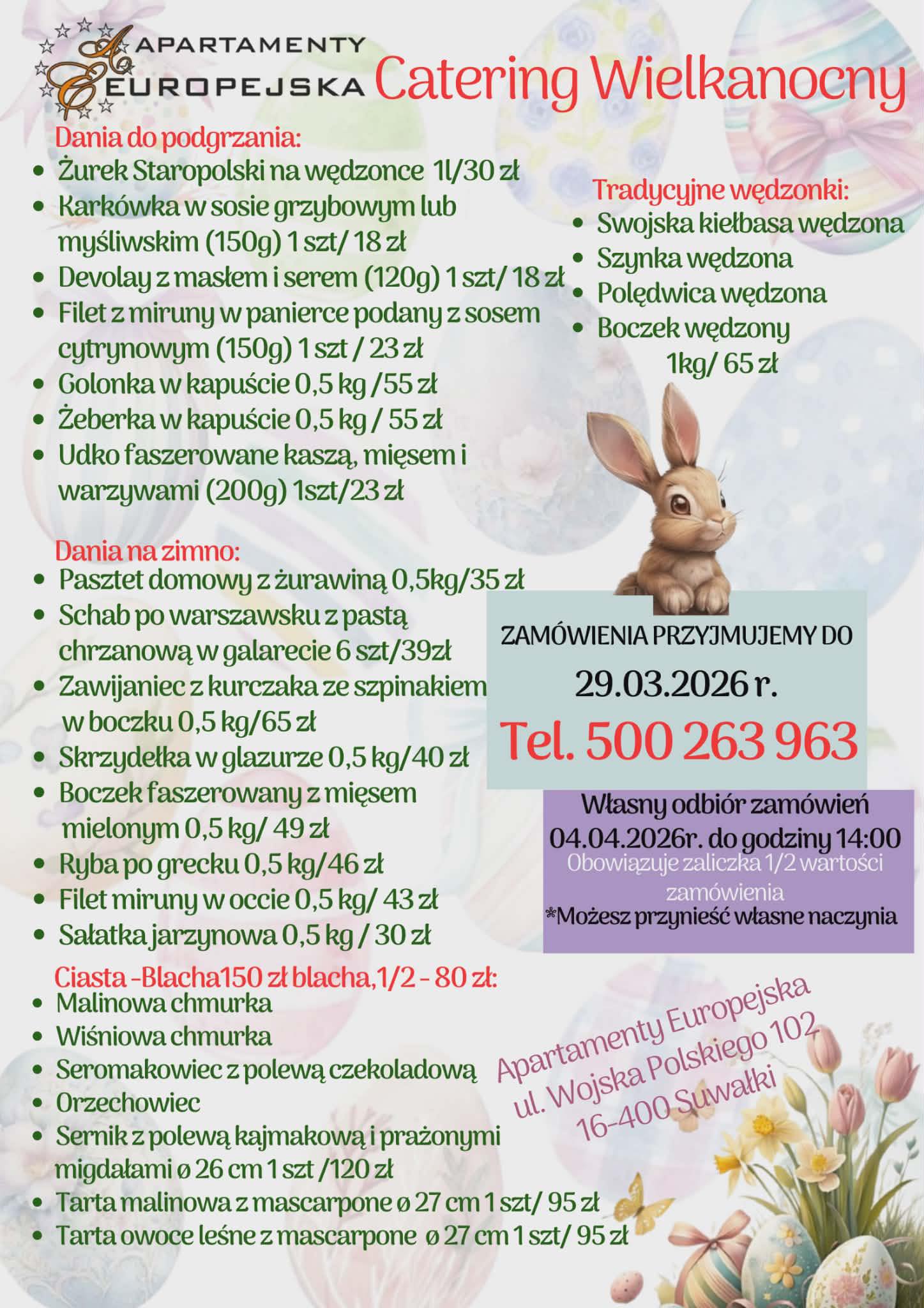 Apartamenty Europejska przy ul. Wojska Polskiego 102 przyjmuje zamówienia do 29 marca pod nr. tel. 500 263 963.