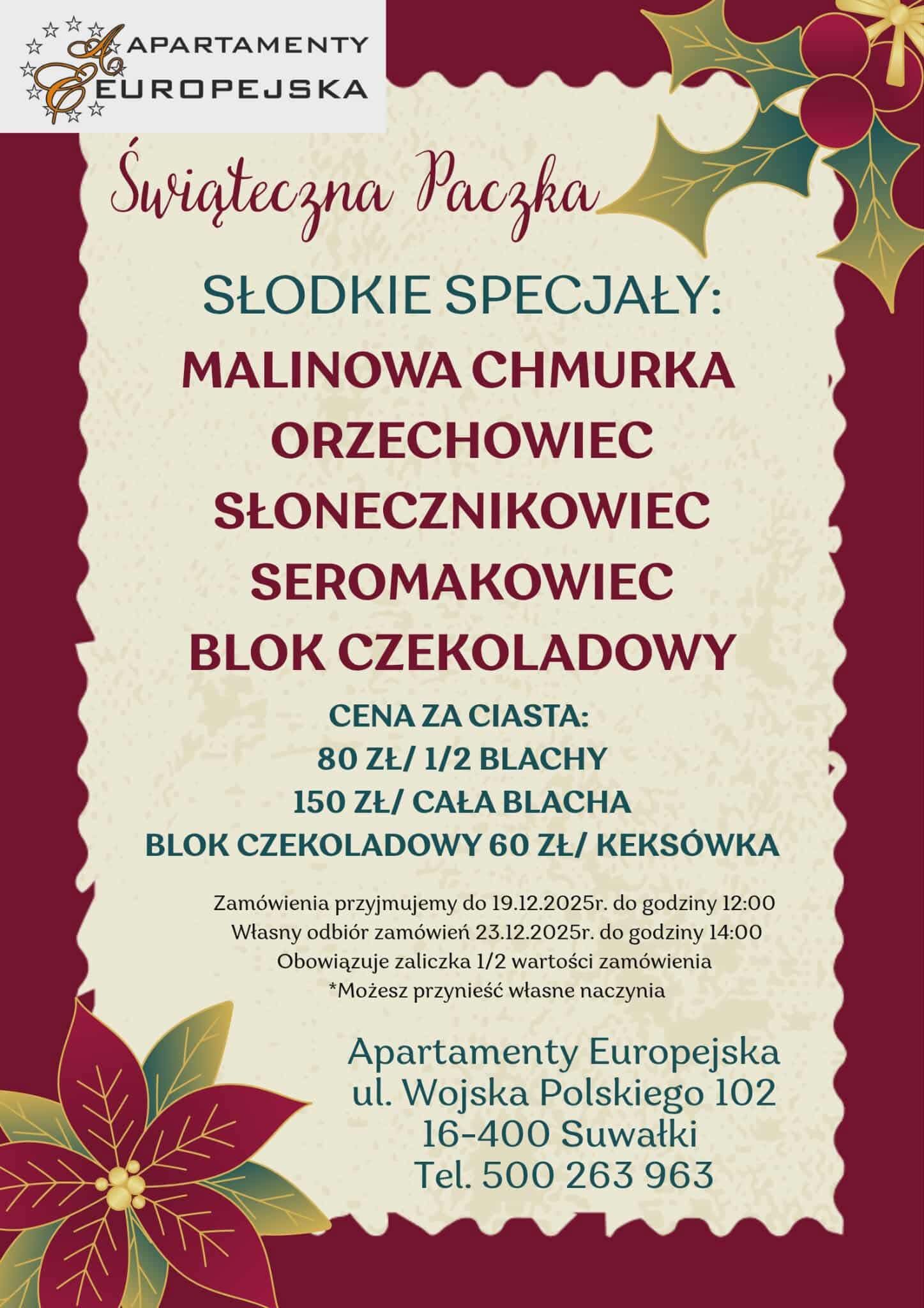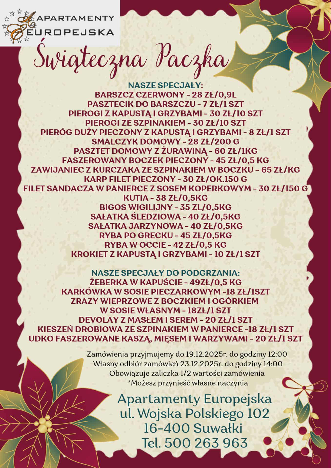 Oszczędźcie sobie pośpiechu, zakupów i gotowania do późna — pozwólcie nam zadbać o to, co pyszne, a Wy skupcie się na tym, co najważniejsze: bliskości, radości i świątecznej atmosferze – zachęca restauracja przy ul. Wojska Polskiego 102 w Suwałkach.