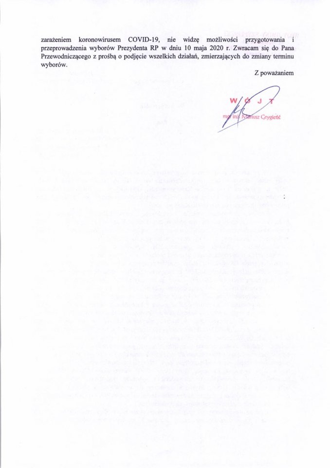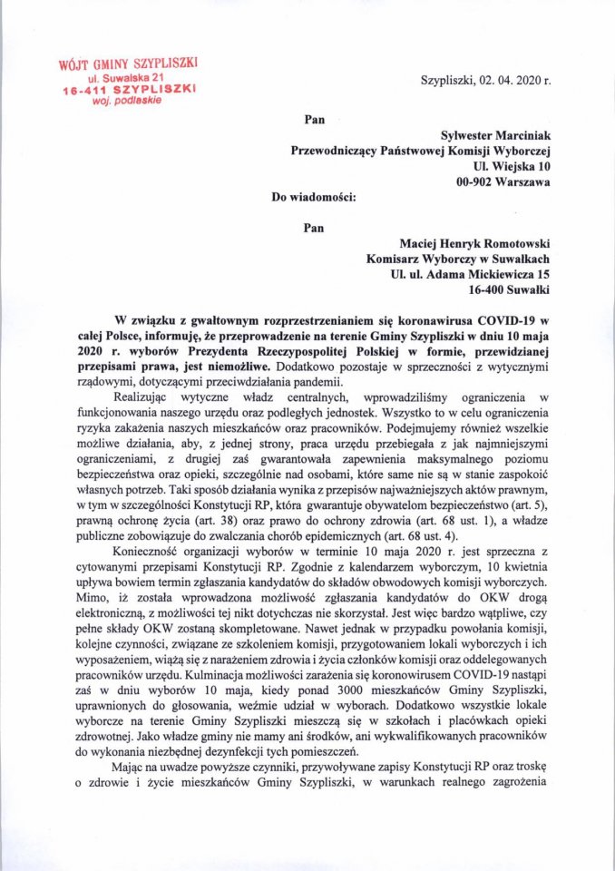 Mariusz Grygieńć, Wójt Gminy Szypliszki apeluje o przełożenie wyborów prezydenckich. W piśmie adresowanym do Przewodniczącego Państwowej Komisji Wyborczej podkreśla, iż w warunkach trwającej epidemii przeprowadzenie wyborów w maju jest niemożliwe: