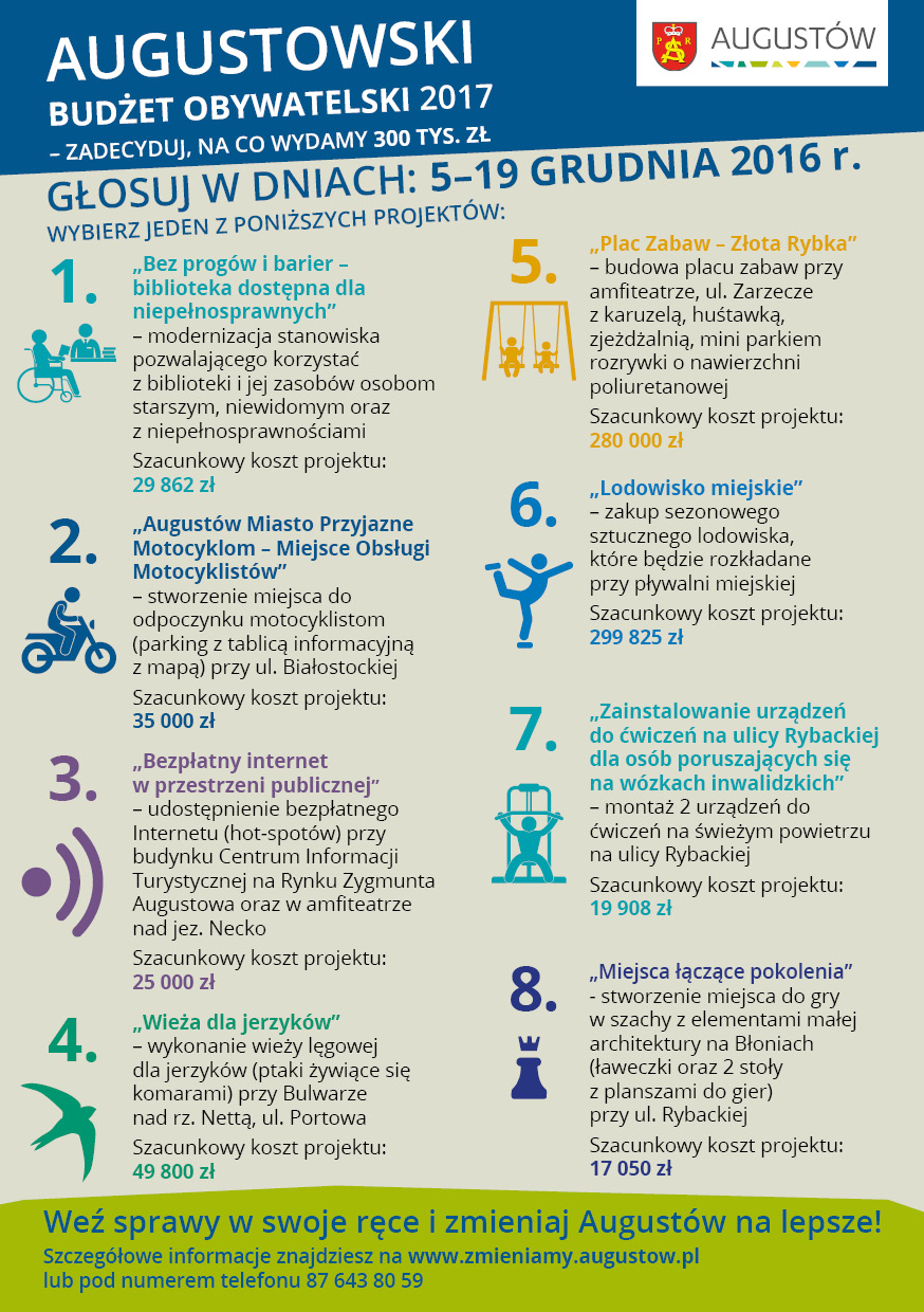 WiÄ™cej informacji oraz listÄ™ projektów poddanych pod gÅ‚osowanie można poznać za poÅ›rednictwem ulotki, która już wkrótce w wersji drukowanej trafi do mieszkaÅ„ i domów augustowian. SzczegóÅ‚owe informacje znajdujÄ… siÄ™ również na stronie www.zmieniamy.augustow.pl.