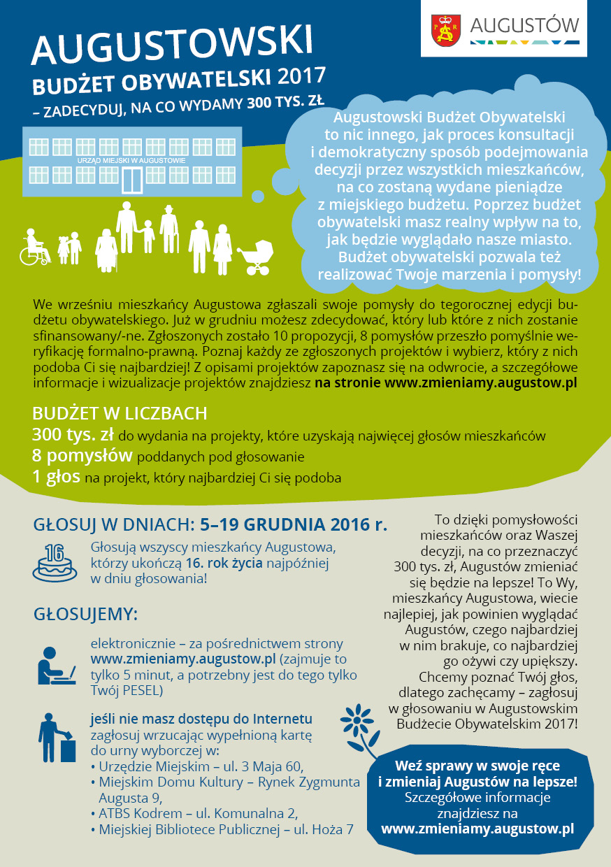 Od 5 do 19 grudnia mieszkaÅ„cy Augustowa bÄ™dÄ… mieli możliwość oddania swojego gÅ‚osu na projekt, który ich zdaniem jest najważniejszy, najpotrzebniejszy do realizacji. W gÅ‚osowaniu mogÄ… wziąć udziaÅ‚ wszyscy mieszkaÅ„cy Augustowa, którzy najpóźniej w dniu gÅ‚osowania majÄ… ukoÅ„czony 16 rok życia. Należy pamiÄ™tać, że jedna osoba może zagÅ‚osować na maksymalnie jeden projekt.