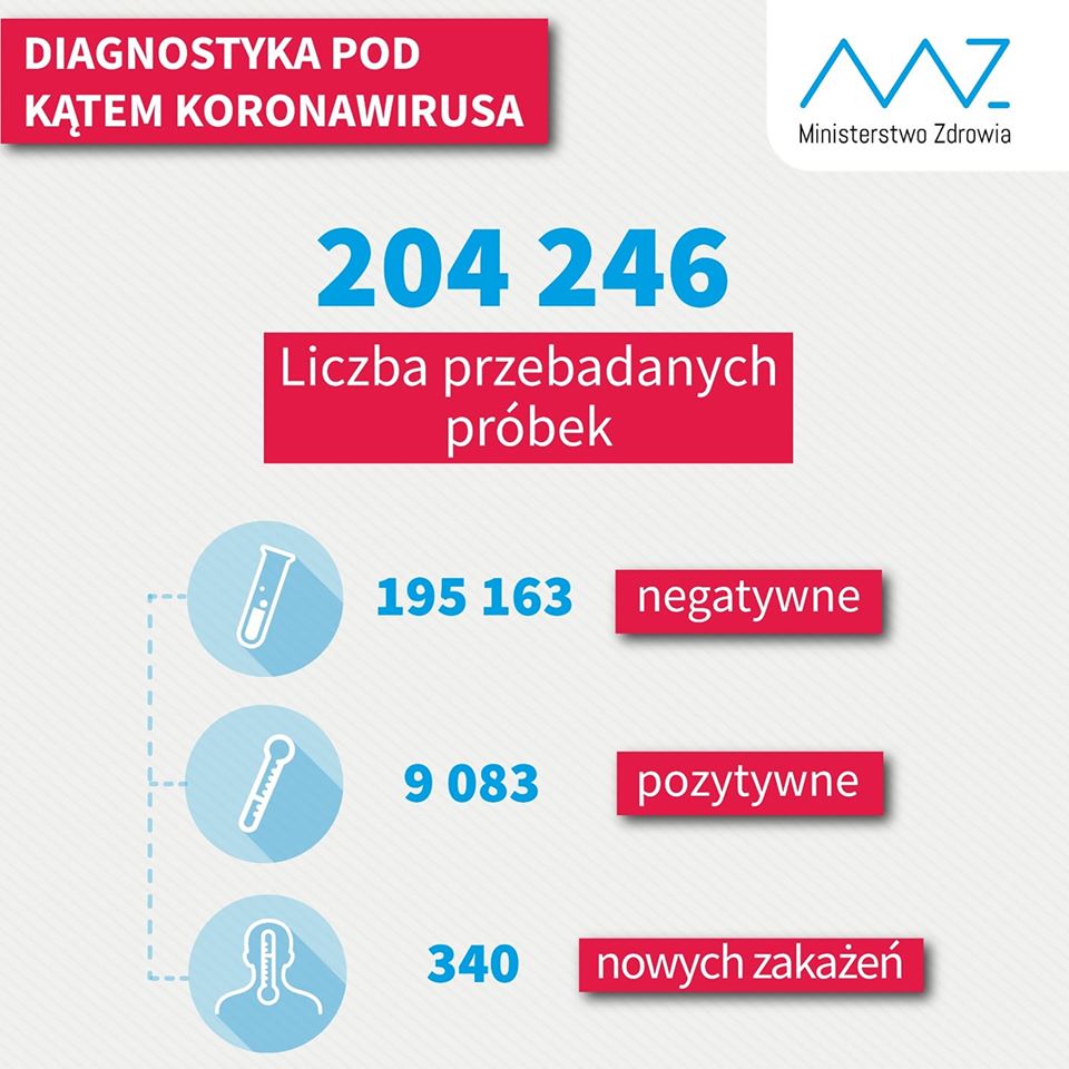 Liczba zakażonych koronawirusem w Polsce wynosi 9082. Zmarło 350, wyzdrowiało 1040 osob.