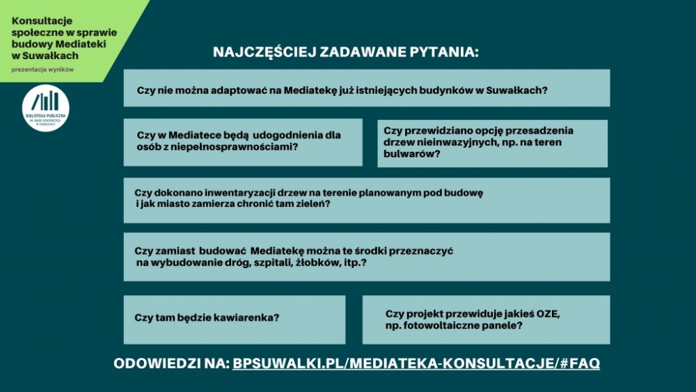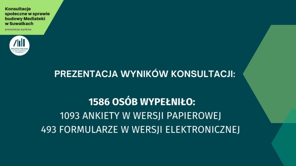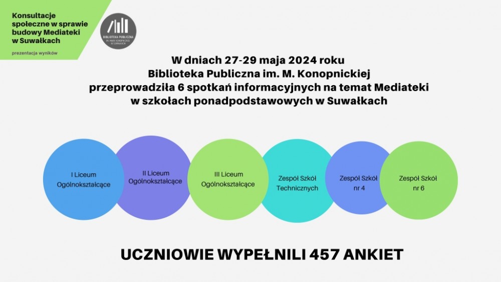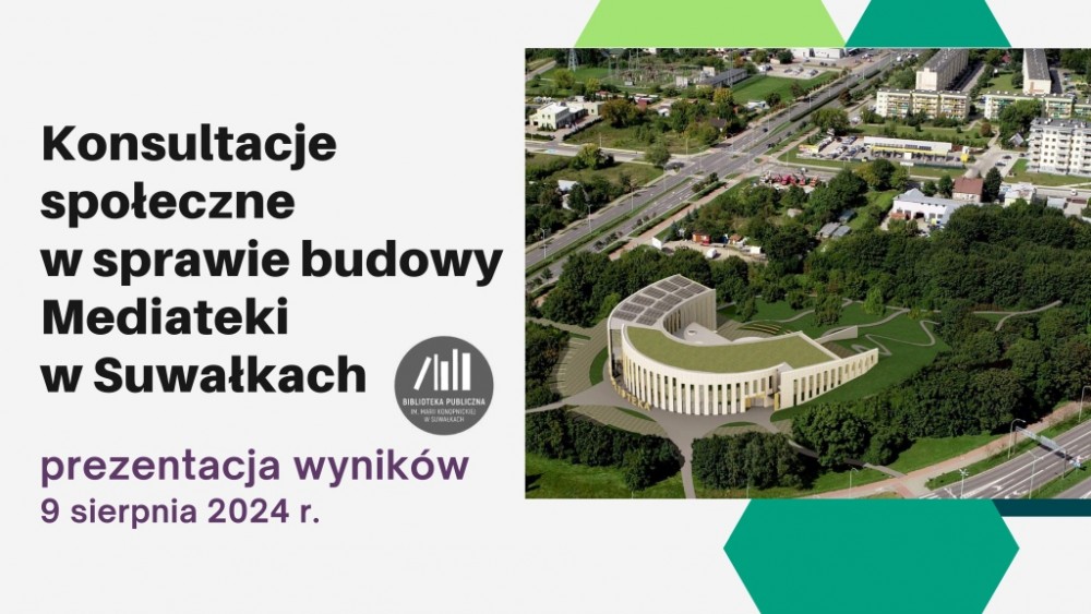 Działania konsultacyjne dotyczące zamiaru budowy Mediateki - Kreatywnego Centrum Książki, Nauki, Edukacji i Technologii w Suwałkach przeprowadziła Biblioteka Publiczna im. Marii Konopnickiej zgodnie z Zarządzeniem Prezydenta Suwałk z dnia 10 czerwca 2024 r.