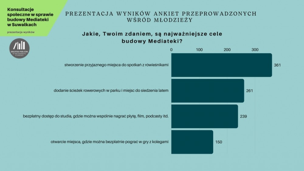 WedÅ‚ug respondentów najważniejszymi funkcjami nowej Mediateki powinno być: biblioteka z książkami, audiobookami, e-bookami (1211 odpowiedzi), miejsce spÄ™dzania wolnego czasu - gamesroom, harcówka, MaÅ‚e Centrum Kopernika SOWA, Midicentrum (923 odp.), prowadzenie dziaÅ‚aÅ„ rozwijajÄ…cych kreatywność i zainteresowania oraz sale do kursów i warsztatów, a także zajęć z edukacji (850 odp.), nowoczesne rozwiÄ…zania - biblioboxy, książkomaty, komputery, ekrany dotykowe, bazy danych, itp. (781 odp.), miejsce imprez bibliotecznych, spotkaÅ„ z komfortowym udziaÅ‚em seniorów i osób niepeÅ‚nosprawnych, organizacji pozarzÄ…dowych, harcerzy, grup nieformalnych i klubów (619).