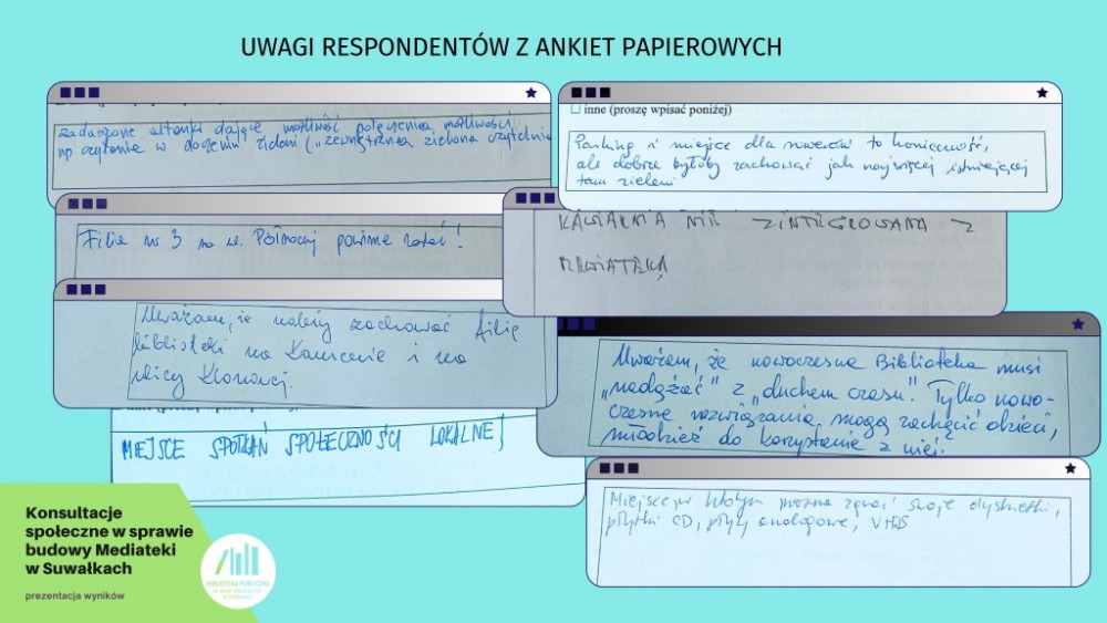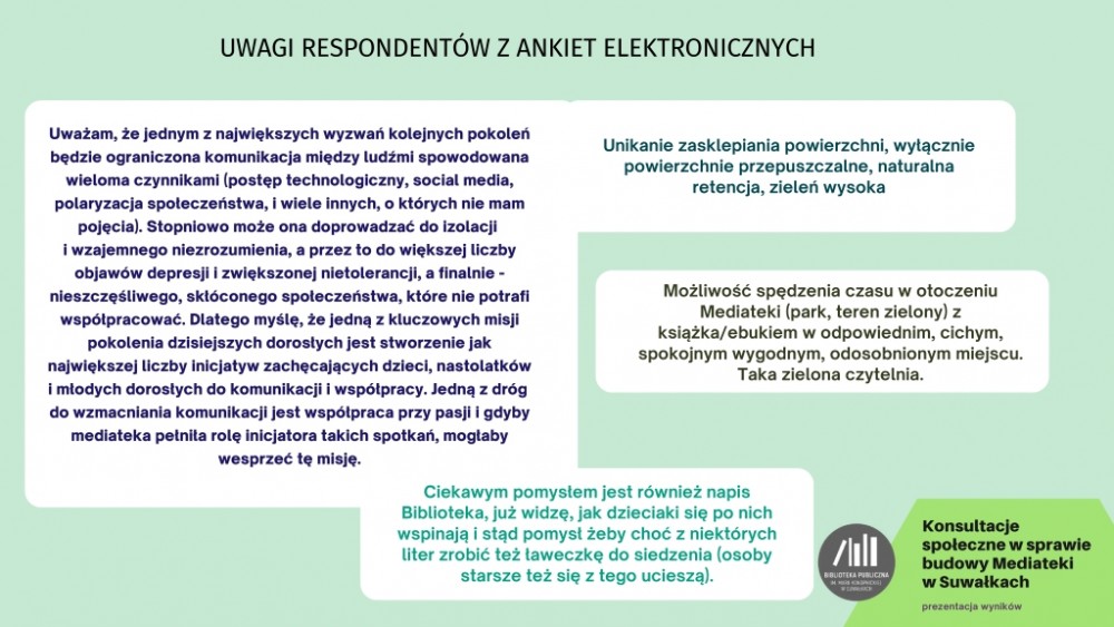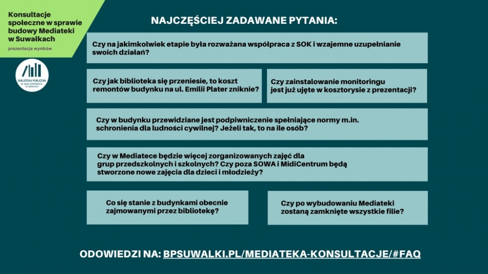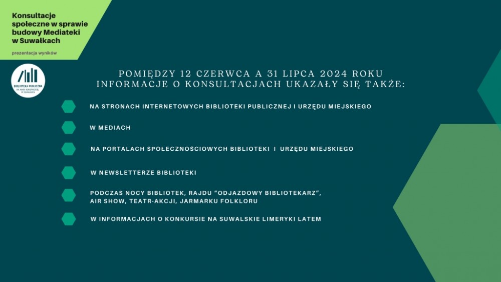 Informacje o konsultacjach byÅ‚y rozsyÅ‚ane e-mailowo, umieszczone na stronie Biblioteki, na stronie UrzÄ™du Miasta oraz w mediach lokalnych i spoÅ‚ecznoÅ›ciowych. Prezentowane byÅ‚y także w czasie „Nocy Bibliotek” oraz na rajdzie „Odjazdowy Bibliotekarz”. Ponadto tegoroczny konkurs „Suwalskie Limeryki Latem” zachÄ™caÅ‚ do wypowiedzi na temat przyszÅ‚oÅ›ci Biblioteki.