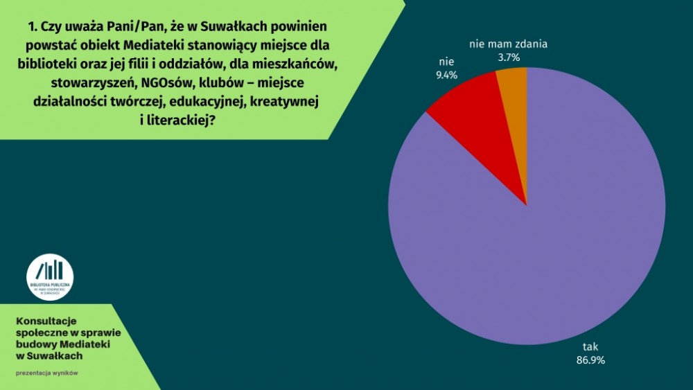 1379 respondentów (86,9%) uważa, że w SuwaÅ‚kach powinna powstać Mediateka - Kreatywne Centrum Książki, Nauki, Edukacji i Technologii.