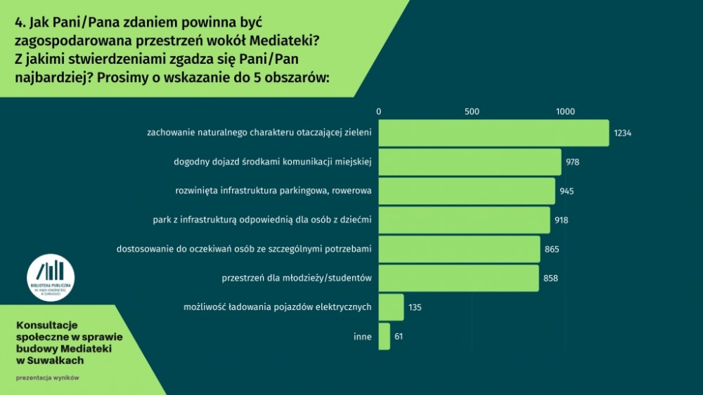 Na pytanie: Jak powinna wyglÄ…dać przestrzeÅ„ wokóÅ‚ Mediateki? - najwiÄ™cej osób (1234)odpowiedziaÅ‚o, że oczekuje zachowania naturalnego charakteru otaczajÄ…cej zieleni, ale także z infrastrukturÄ… odpowiedniÄ… dla osób z dziećmi (918 odp.).