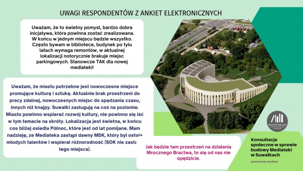 - Dwa lata temu Rada Miejska przyjęła Uchwałę w sprawie zasadnoÅ›ci budowy Mediateki. MieszkaÅ„cy w konsultacjach spoÅ‚ecznych wydali dość jednoznaczny werdykt opowiadajÄ…c siÄ™ za budowÄ… tego obiektu. JesteÅ›my do tego przygotowani. Mamy dokumentacjÄ™ i pozwolenie na budowÄ™. Mamy na to pieniÄ…dze zewnÄ™trzne. Staramy siÄ™ o kolejne Å›rodki. MyÅ›lÄ™, że daje nam to wyraźny kierunek w jakim powinniÅ›my zmierzać. Zabieramy siÄ™ do prac by ruszyć z budowÄ… nowoczesnej Mediateki – podsumowaÅ‚ konsultacje spoÅ‚eczne CzesÅ‚aw Renkiewicz, prezydent SuwaÅ‚k.