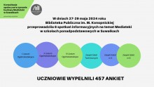Wyniki uzyskane od uczniów: 428 osób (93,6%) popiera budowÄ™ Mediateki, 20 osób (4,4%) uważa, że nie jest potrzebna, a 9 osób ( 2%) nie ma zdania.
