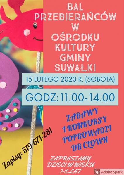 Urząd Gminy Suwałki zaprasza najmłodszych na Bal Przebierańców do Ośrodka Kultury Gminy Suwałki. Impreza odbędzie się w najbliższą sobotę. Początek o 11.00.