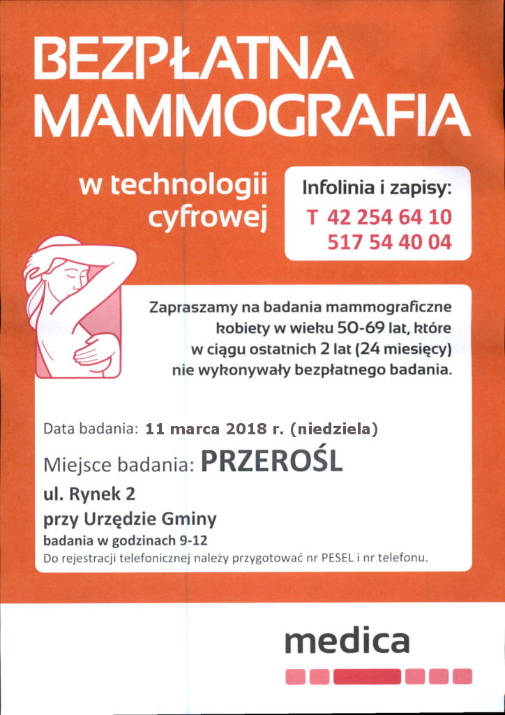 Badanie odbÄ™dzie siÄ™ 11 marca na rynku w PrzeroÅ›li, w godz. 9.00-12.00. Jest bezbolesne. DziÄ™ki mammografii można wykryć nowotwór piersi w jego wczesnej fazie, co zasadniczo zwiÄ™ksza szanse na caÅ‚kowite wyzdrowienie. WiÄ™cej informacji na plakacie.