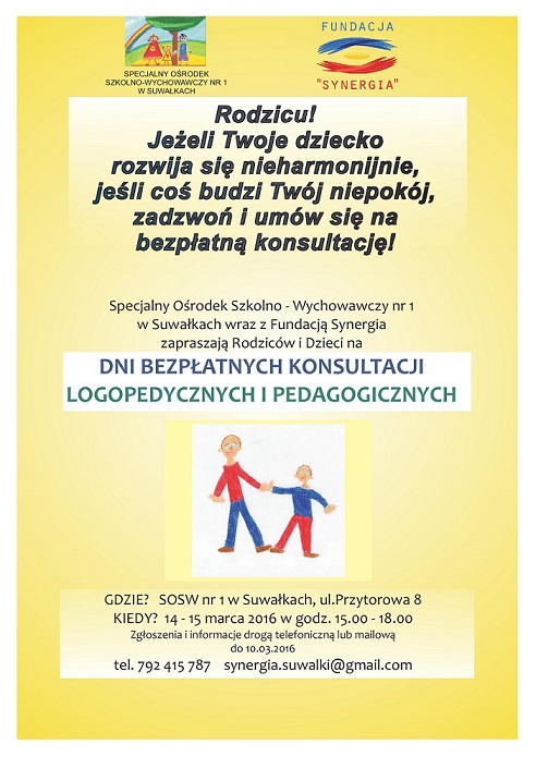 W dniach 14 – 15 marca tj. poniedziałek i wtorek, w godzinach 15.00 - 18.00, Specjalny Ośrodek Szkolno - Wychowawczy Nr 1 w Suwałkach wraz z Fundacją "Synergia" w ramach dni otwartych organizują BEZPŁATNE KONSULTACJE LOGOPEDYCZNE i PEDAGOGICZNE.