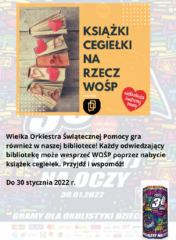 Już po raz kolejny Gminna Biblioteka Publiczna w Wiżajnach gra razem z Wielką Orkiestrą Świątecznej Pomocy. Na wszystkich, którzy odwiedzą bibliotekę do 30 stycznia, czekają książki – cegiełki. Dochód z ich sprzedaży trafi do Orkiestrowej puszki.