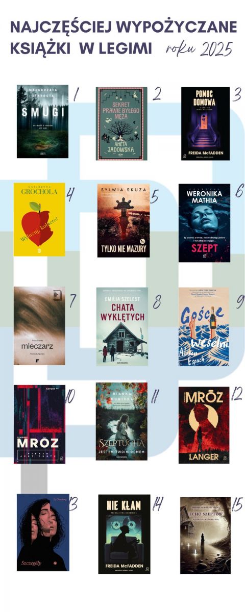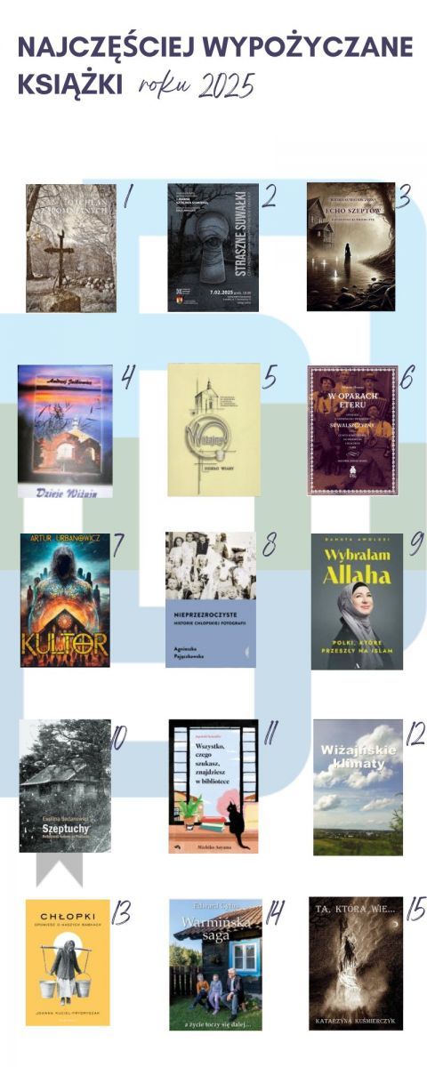 Początek roku w Gminnej Bibliotece w Wiżajnach to tradycyjna od kilku lat infografika obrazująca skrótowe podsumowanie roku 2025 w kategoriach: najlepsi czytelnicy i najczęściej wypożyczane książki roku w formie tradycyjnej oraz po raz pierwszy najczęstsze wypożyczenia książek z platformy Legimi (ebooków i audiobooków).
