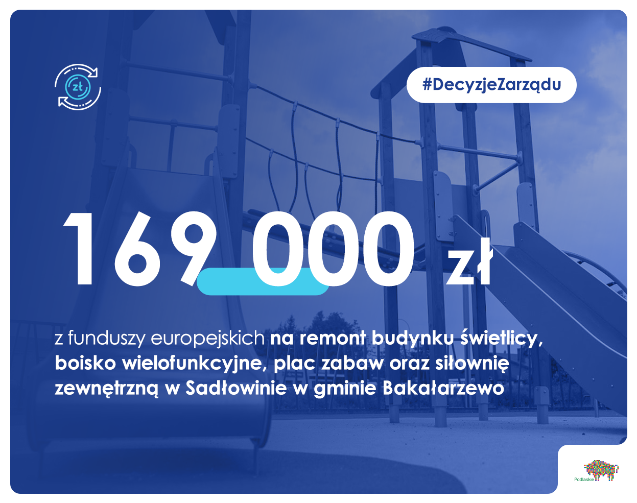 Gmina Bakałarzewo zagospodaruje teren w Sadłowinie. Wyremontuje budynek świetlicy i schody. Natomiast na gruncie obok powstanie: boisko wielofunkcyjne, plac zabaw (a na nim piaskownica, huśtawka, zjeżdżalnia i karuzela), a także siłownia zewnętrzna z urządzeniami typu: biegacz, orbitrek, wioślarz. Teren zostanie ogrodzony. Inwestycja wyniesie 228 tys. zł, a dofinansowanie pokryje 169 tys. zł.