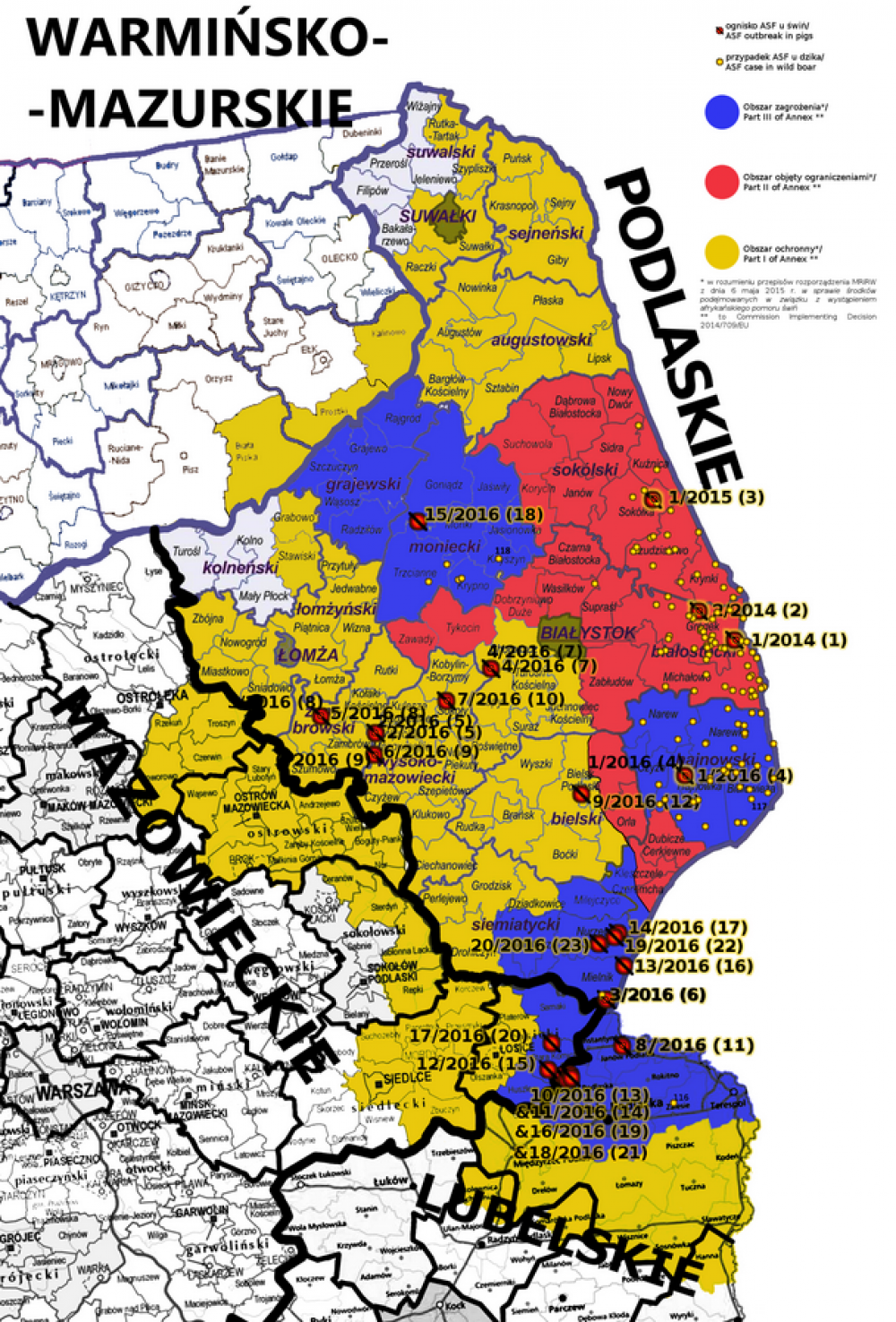- Afrykański Pomór Świń wciąż zagraża. Pojawiają się kolejne ogniska wirusa na Litwie, Łotwie i Ukrainie. Przenoszą go głównie dziki. Gminy Raczki, Szypliszki, Rutka Tartak i Suwałki znajdują się w żółtej strefie ochronnej. Rolników obowiązują zasady bioasekurkacji – mówi Remigiusz Franciszek Kulesza, powiatowy lekarz weterynarii w Suwałkach.