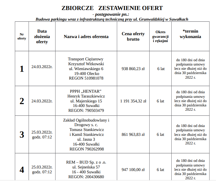 Na inwestycjÄ™ realizowanÄ… z Suwalskiego Budżetu Obywatelskiego miasto zamierzalo zaÅ› przeznaczyć 875 160,00 zÅ‚. Jeżeli oferta zlożona przez suwalskqa spóÅ‚kÄ™ Zaklad Ogólnobudowlany i Drogowy Tomasz Stankiewicz i Kamil Stankiewicz speÅ‚nia wymogi formalne, to ta firma, po podpisaniu umowy, bÄ™dzie miaÅ‚a 180 dni na realizacjÄ™ zadania.