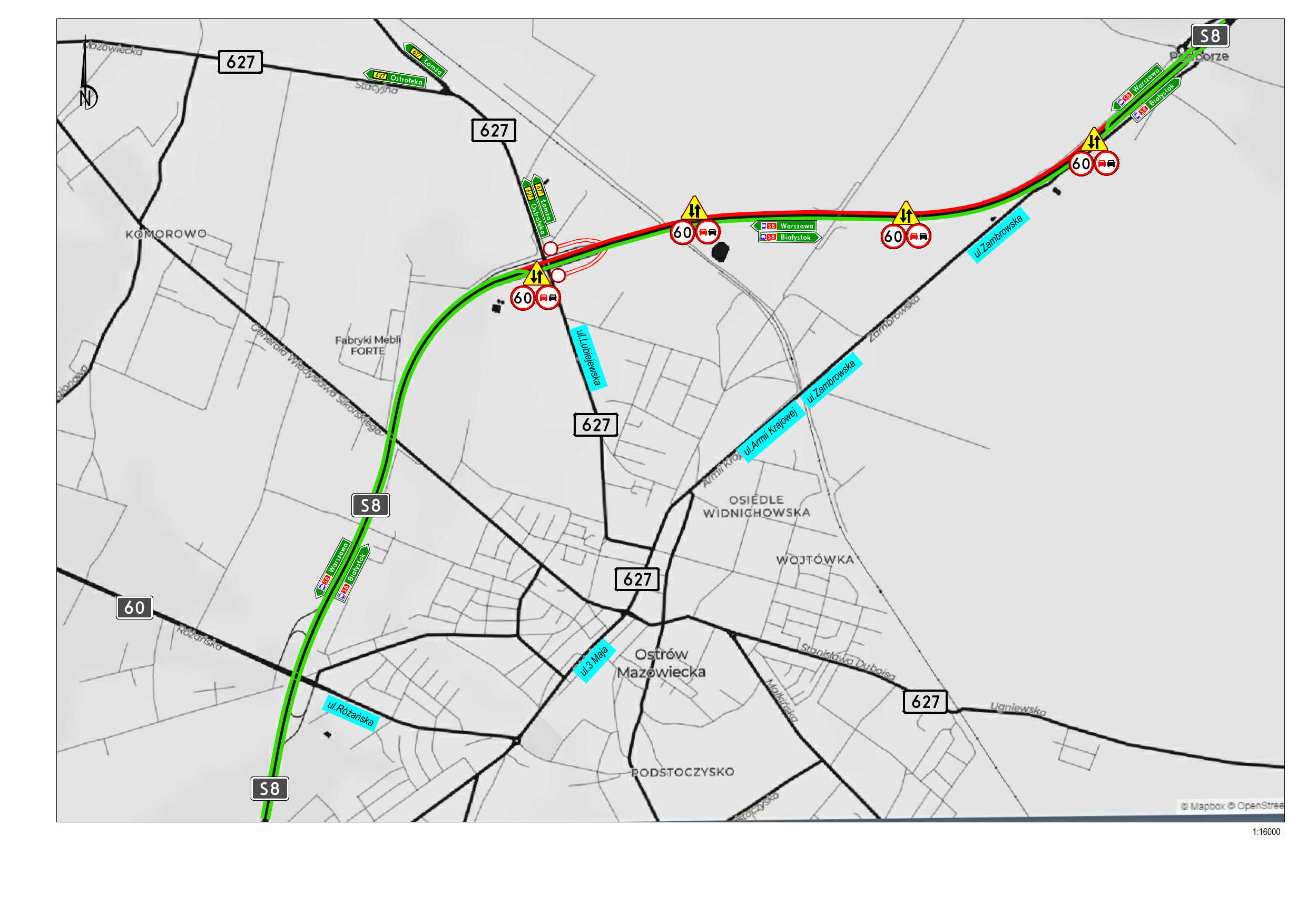 Po zamknięciu północnej jezdni S8 (pomiędzy węzłem Ostrów Mazowiecka Północ (dawniej węzeł Łomża) a istniejącym węzłem Podborze) kierowcy będą mieli do dyspozycji po jednym pasie ruchu w kierunku Warszawy i Białegostoku. Będzie obowiązywało ograniczenie prędkości do 60 km/h i zakaz wyprzedzania. Drogowcy apelują o ostrożność i stosowanie się do oznakowania. Tymczasowa organizacja ruchu będzie obowiązywała tam praktycznie do końca trwania robót. W okresach wzmożonego ruchu utrudnienia mogą powodować istotne spowolnienie ruchu, a nawet zatory.