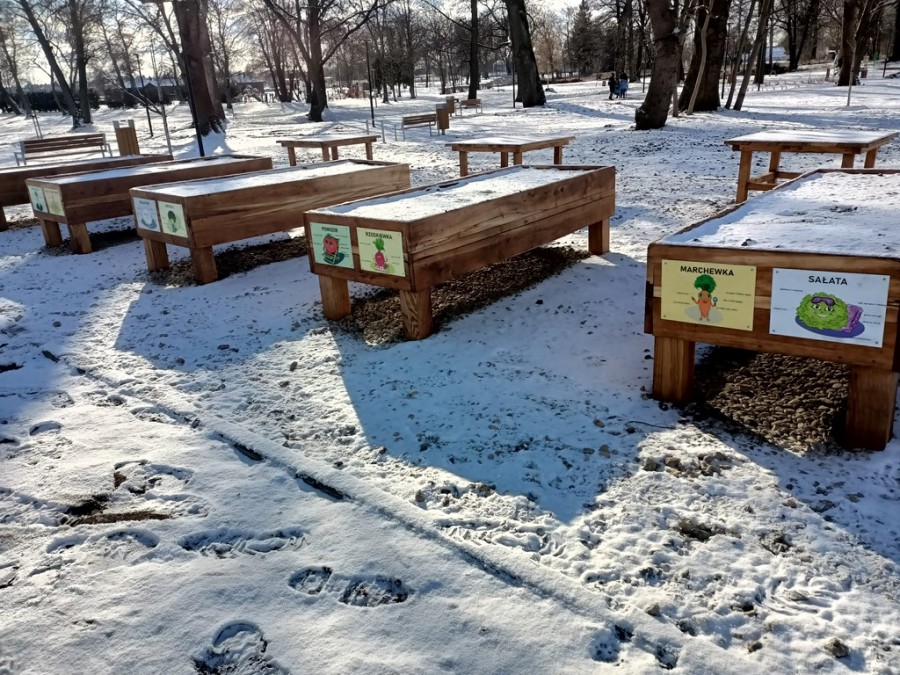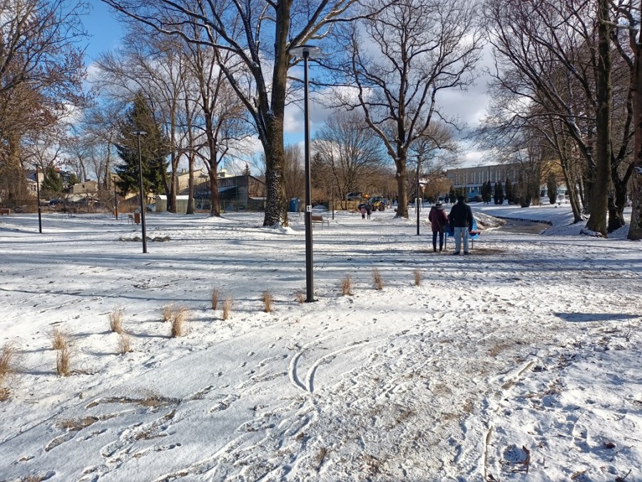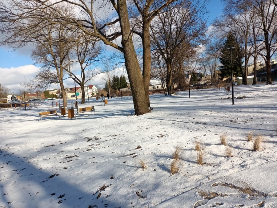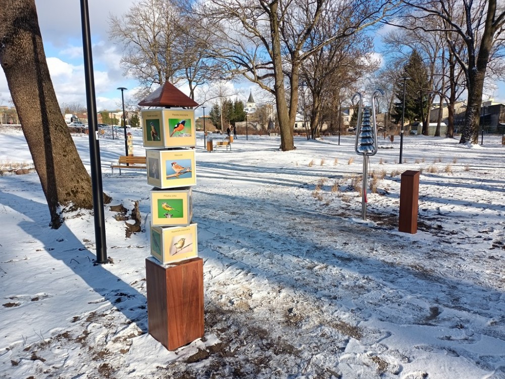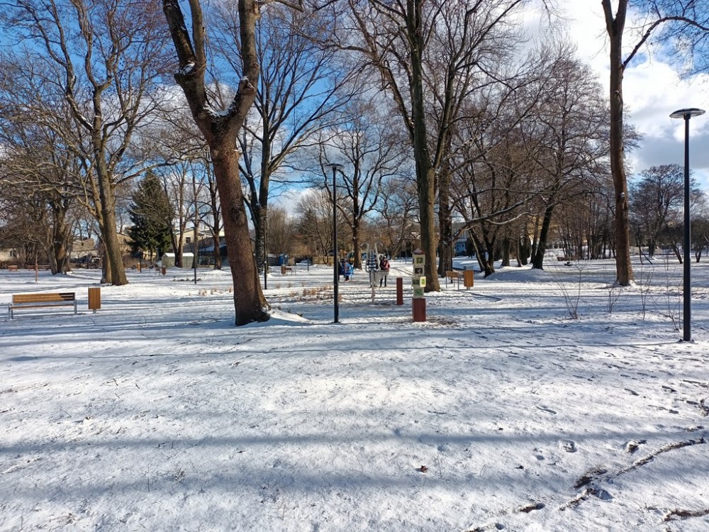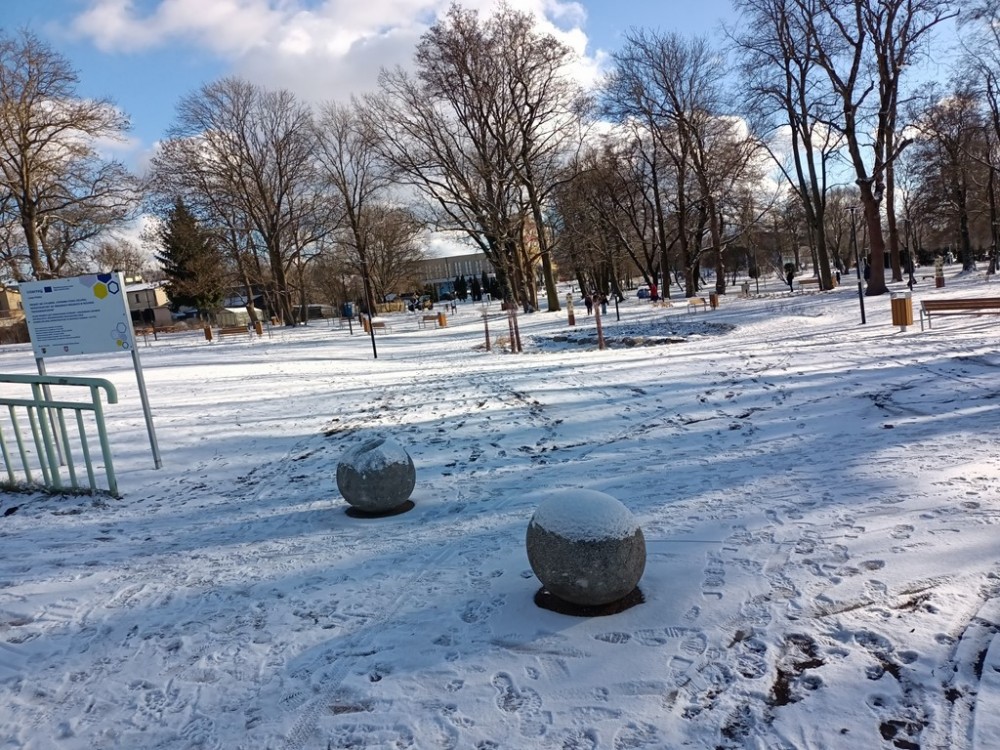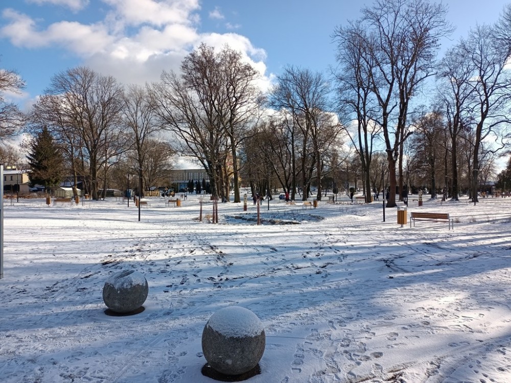 Po sobotnich opadach śniegu, na wzrok oddziaływuje kolor bieli. W niedzielę spacerowicze bawili się dźwiękowymi elementami wyposażenia parku. Będzie to doskonałe miejsce zajęć dla dzieci.