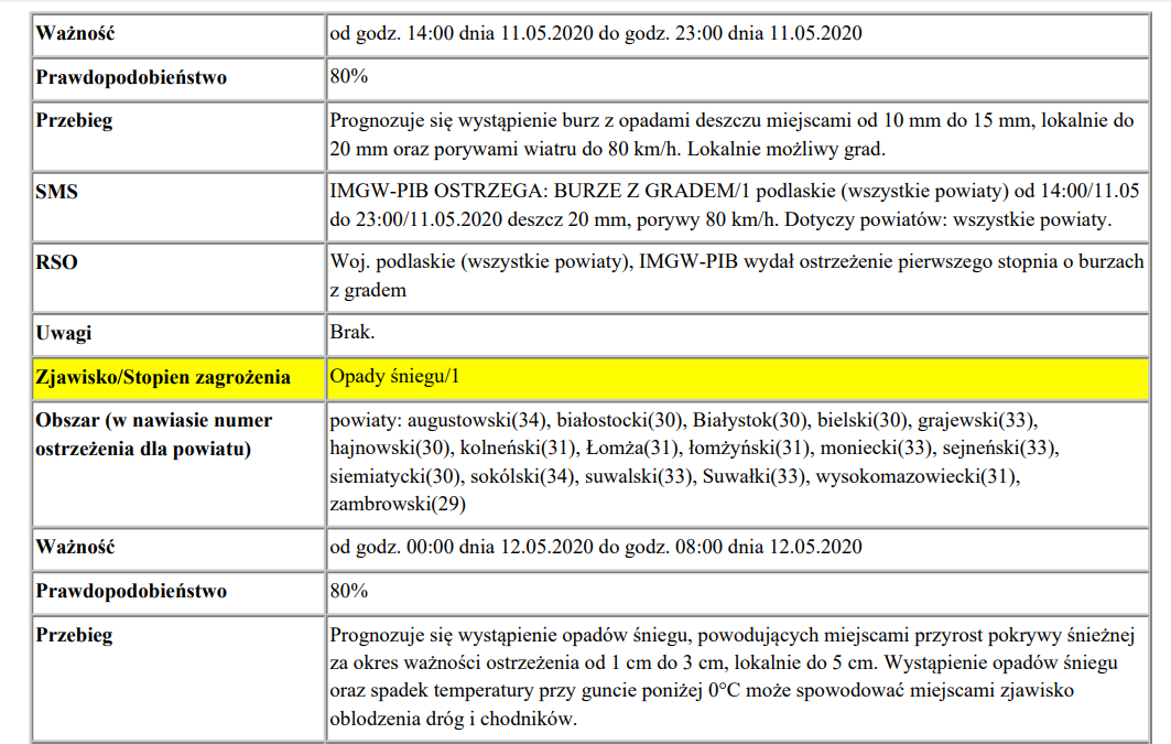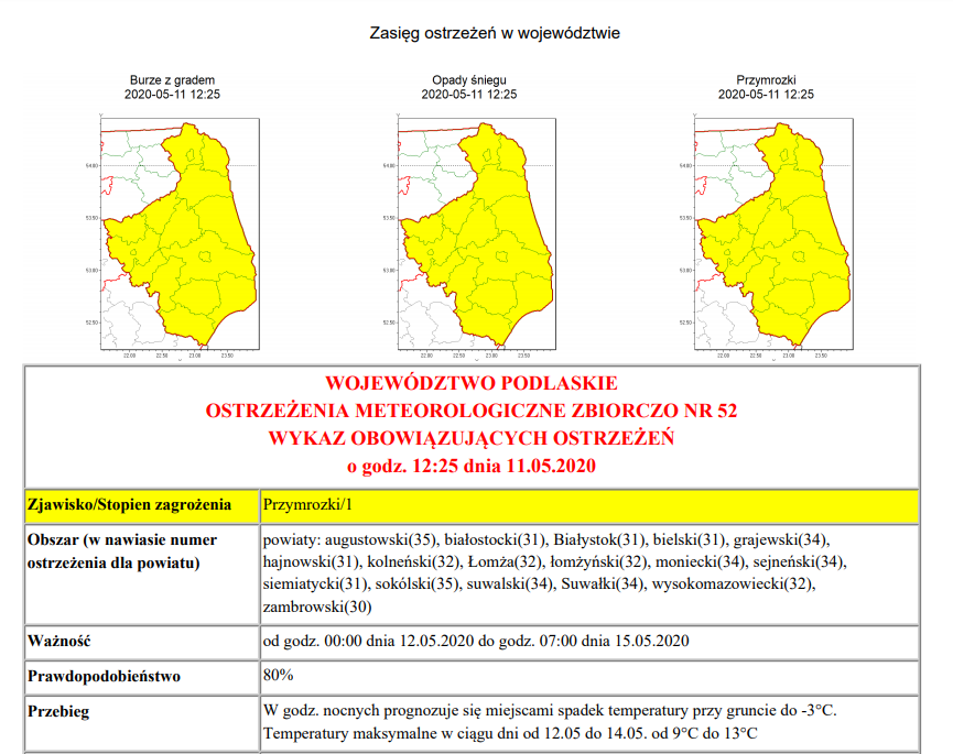 Teraz, opady śniegu białostoccy synoptycy zapowiadają w nocy z poniedziałku na wtorek 12 maja. Wcześniej, jak brzmią ostrzeżenia, przez region mają przejść burze z gradem.