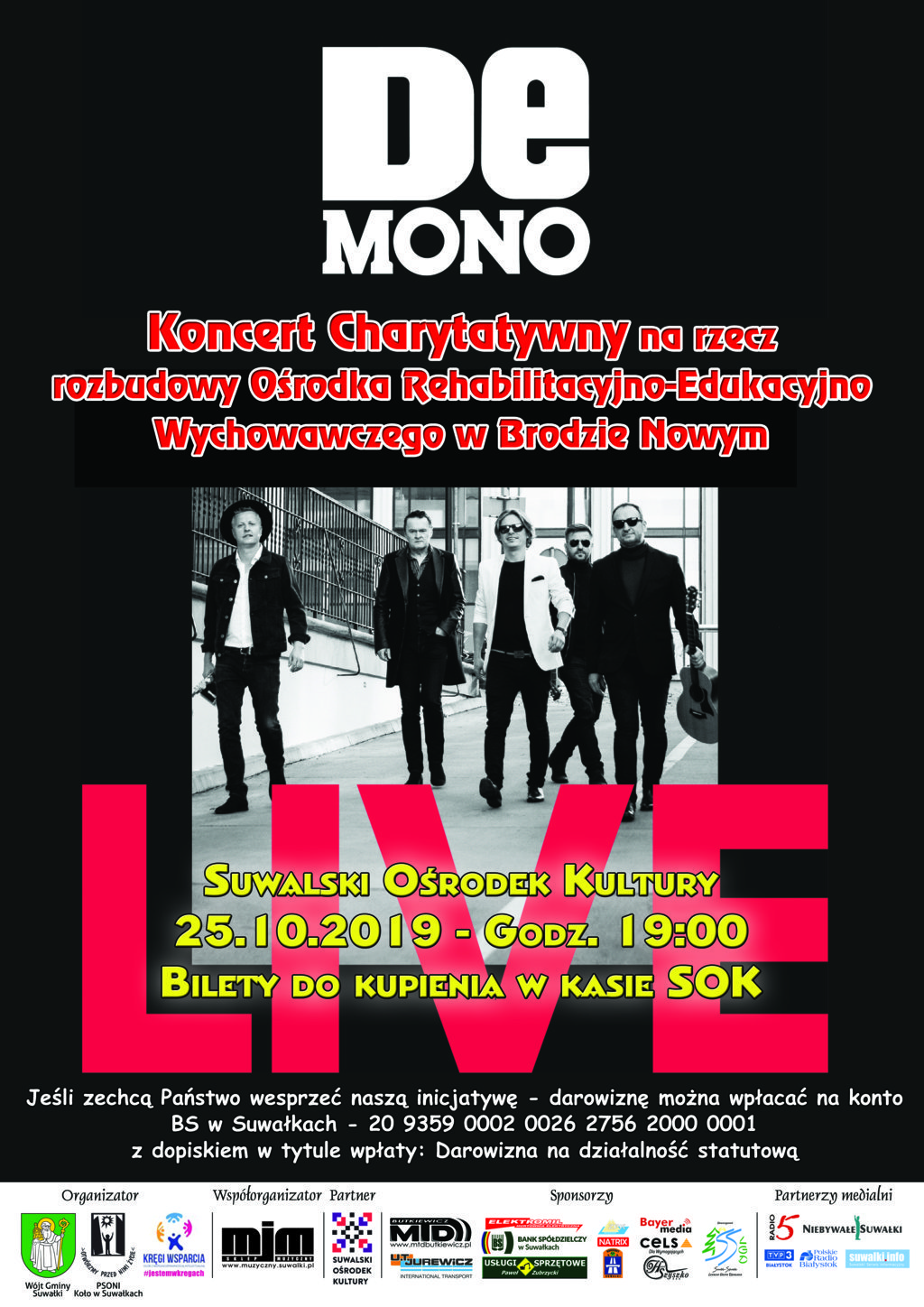 Urząd Gminy Suwałki oraz Podlaskie Stowarzyszenie Osób Niepełnosprawnych Intelektualnie Koło w Suwałkach zapraszają na koncert charytatywny zespołu De Mono. Koncert odbędzie się 25 października w Suwalskim Ośrodku Kultury. Dochód z niego zostanie przeznaczony na rozbudowę Ośrodka Rehabilitacyjno-Edukacyjno-Wychowawczego w Brodzie Nowym.
