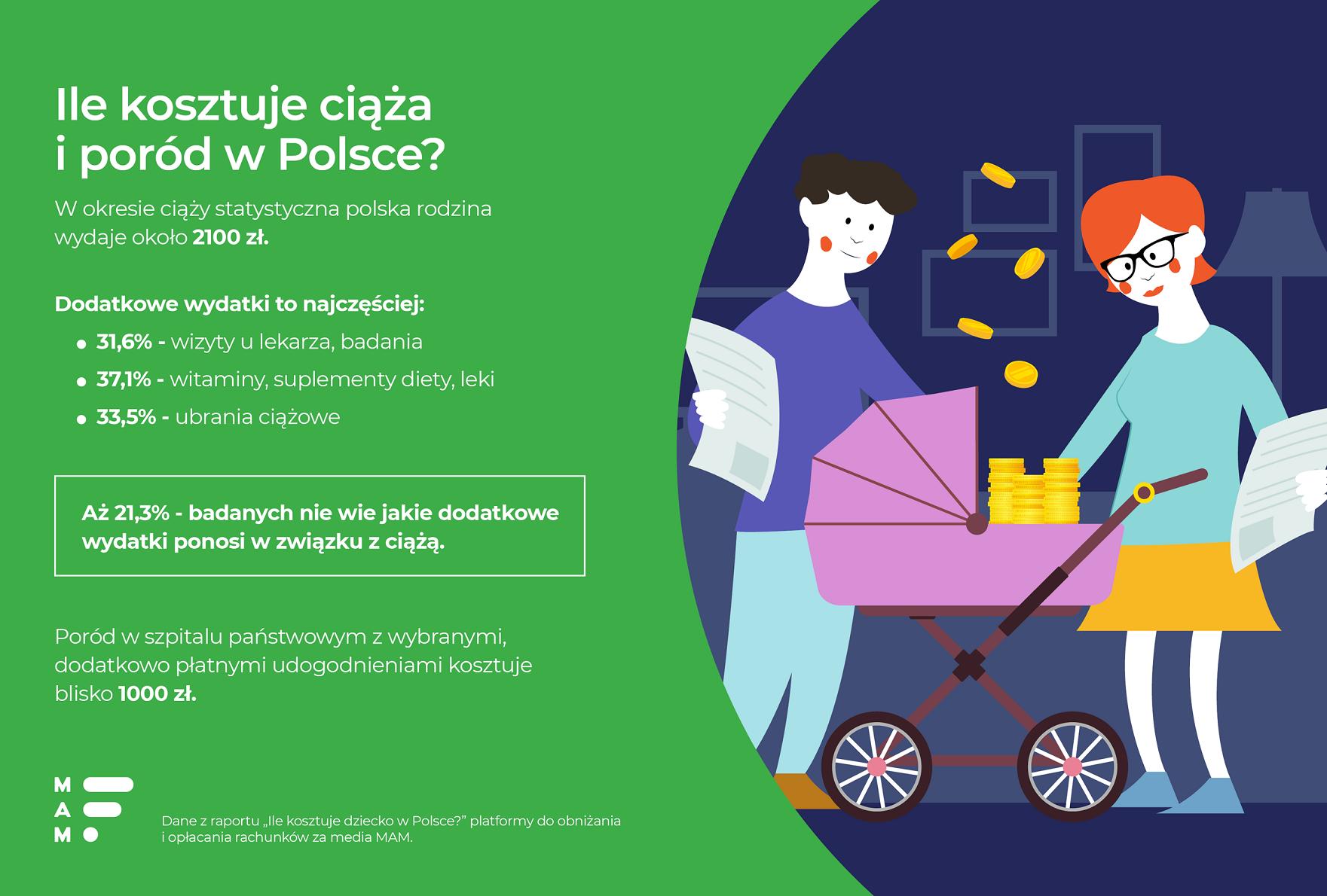 Posiadanie dzieci to niemały wydatek. Wychowanie i edukacja potomstwa wymaga od rodziców dość dużych nakładów finansowych. Dodatkowe opłaty pojawiają się jednak już w okresie ciąży i w związku z porodem. Jak wynika z raportu „Ile kosztuje dziecko w Polsce?” przygotowanego przez platformę do obniżania i opłacania rachunków za media MAM, [...] okres ciąży to dla statystycznej polskiej rodziny koszt średnio 2100 zł. Sam poród natomiast, jeśli uwzględnia skorzystanie z dodatkowo płatnych udogodnień w szpitalu państwowym, to wydatek rzędu 1000 zł. Gdy rodzice decydują się na skorzystanie z usług placówek prywatnych, koszty te mogą być nawet pięciokrotnie wyższe.