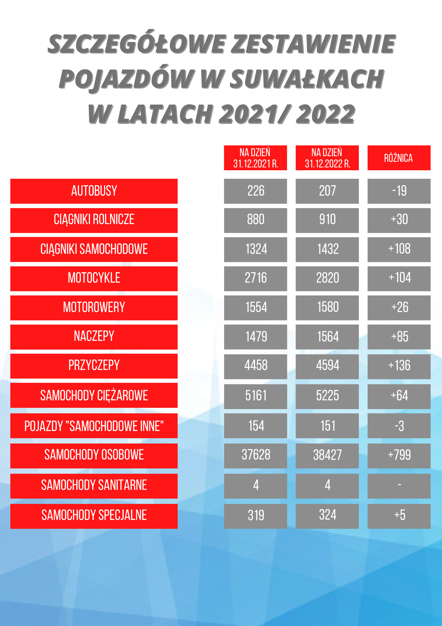 Ponad 1000 pojazdów więcej porusza się po suwalskich ulicach niż jeszcze rok wcześniej. W 2021 roku było ich 55903. Do końca 2022 roku już 57238.