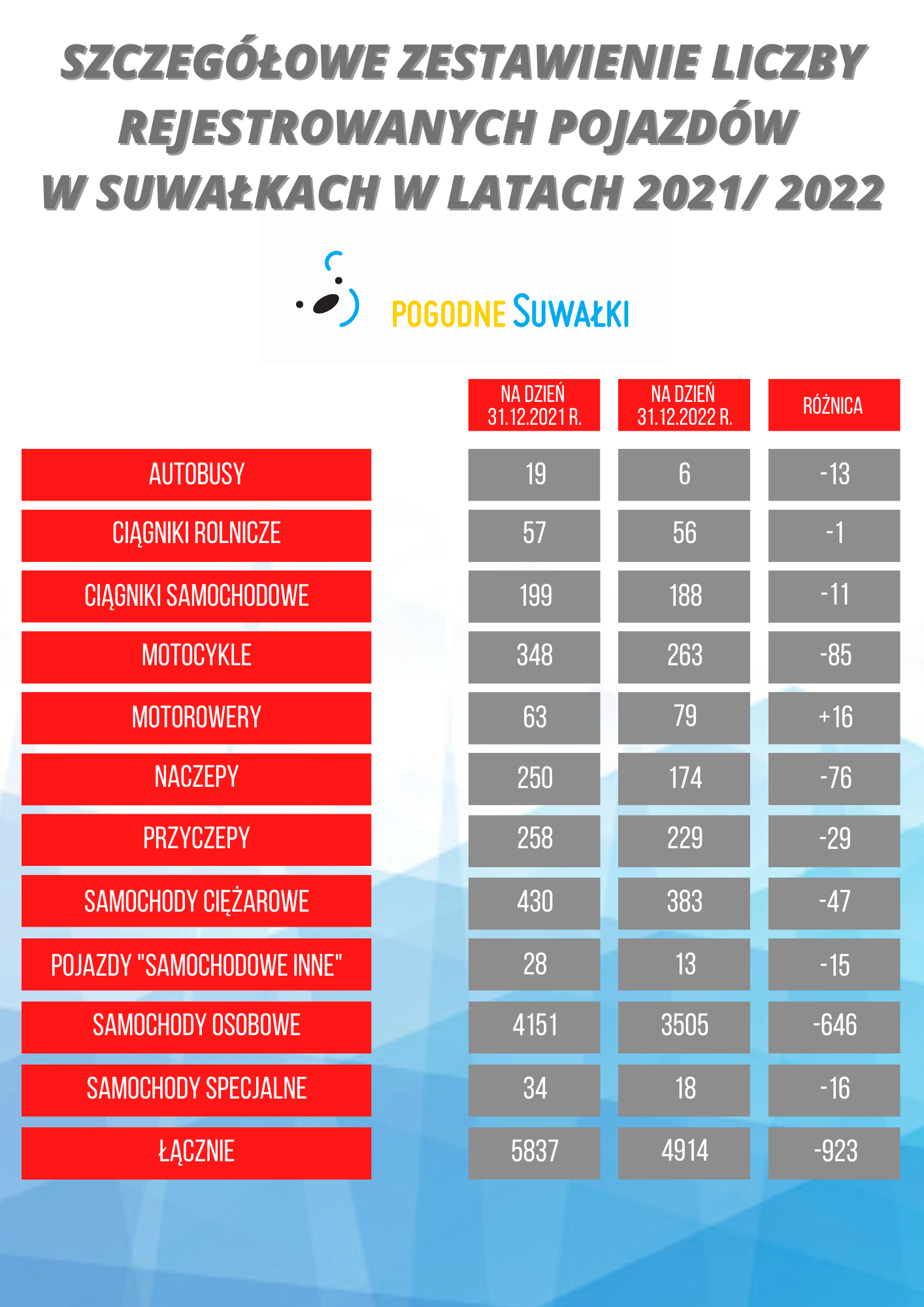 Jednak porównujÄ…c dane dotyczÄ…ce liczby rejestrowanych pojazdów to ich liczba spadÅ‚a. W 2021 roku w Wydziale Komunikacji zarejestrowano ich w sumie 5837. W ubiegÅ‚ym roku o blisko 1000 mniej bo dokÅ‚adnie 4914.