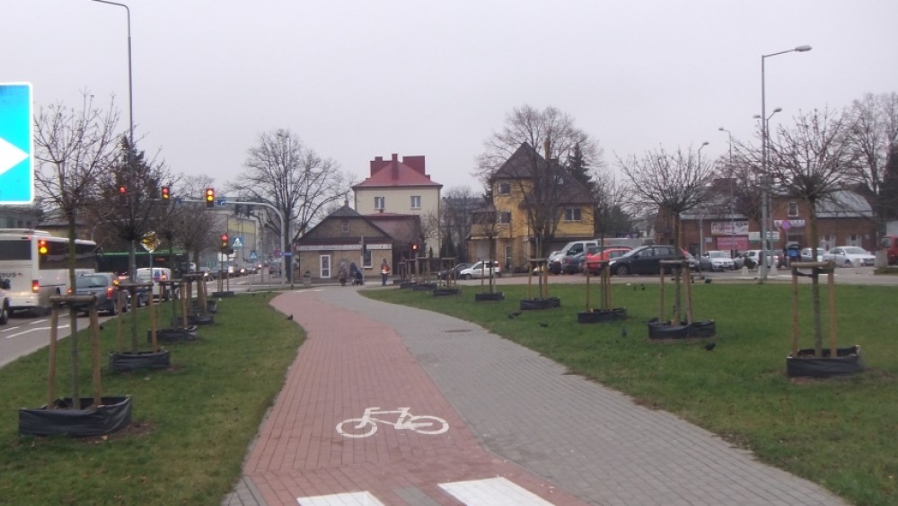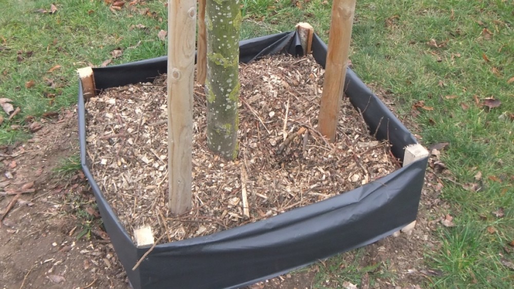 Drzewka najbardziej narażone na sól sypanÄ… przez sÅ‚użby miejskie na oblodzone i zaÅ›nieżone zimÄ… drogi, zostaÅ‚y obsypane grubÄ… warstwÄ… zrÄ™bków.