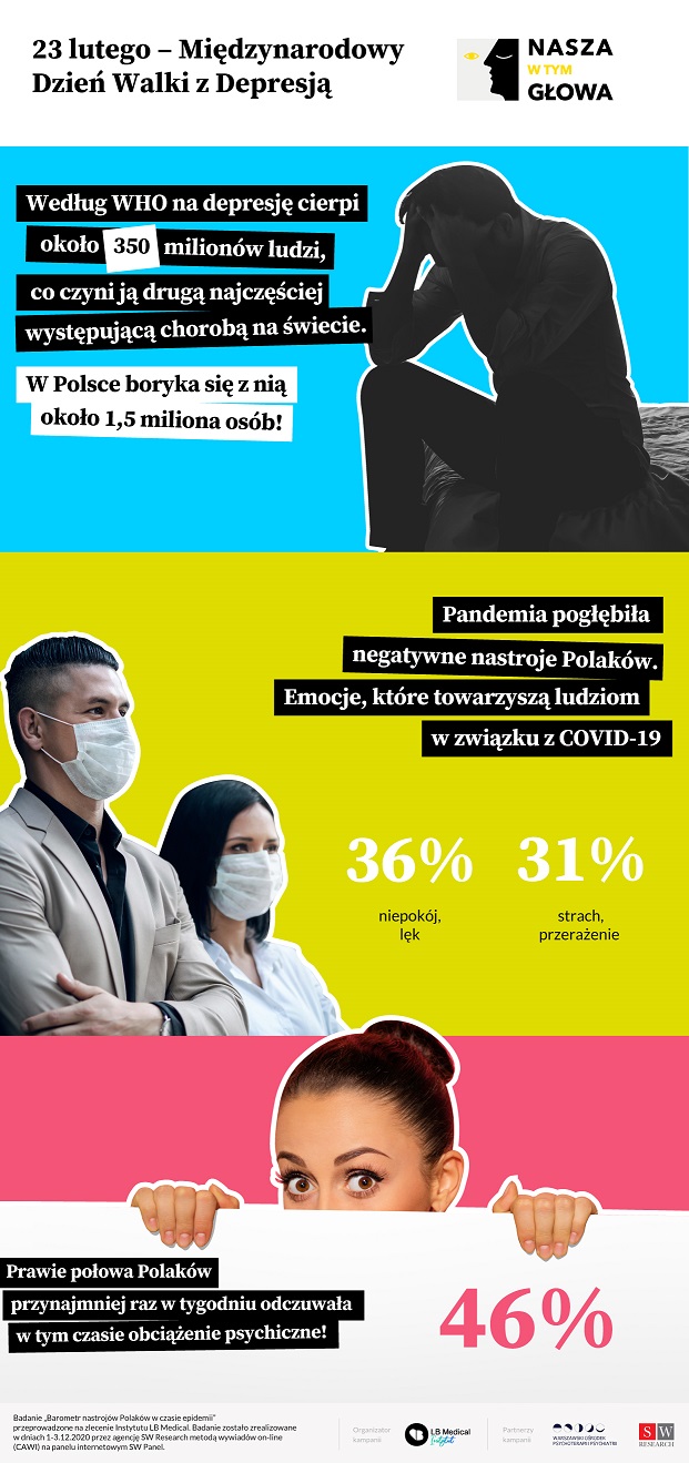 - Liczby związane ze wzrostem zachorowań na depresję są zatrważające. Chorych przybywa, problem narasta, a wciąż mamy wiele utrudnień w zakresie leczenia. Niestety depresja wciąż bardzo często jest chowana w kieszeń, maskowana. Chcemy przełamywać te bariery i stwarzać przestrzeń do rozmów trudnych. Dlatego z okazji Międzynarodowego Dnia Walki z Depresją organizujemy streaming na żywo na naszym profilu facebookowym Nasza w tym głowa z udziałem wybitnej ekspertki Katarzyny Grott z Warszawskiego Ośrodka Psychoterapii i Psychiatrii, na którą wszystkich serdecznie zapraszam! Mając też świadomość, że edukacja jest niezbędna i bardzo Polakom potrzebna, wystartowaliśmy z portalem www.naszawtymgłowa.pl, na którym można znaleźć ważne informacje na temat zdrowia psychicznego i jego zaburzeń oraz wywiady z ekspertami, artykuły, czy podcasty. Chcemy uwrażliwić społeczeństwo na pierwsze objawy depresji. Chcemy przekazywać wskazówki, jak można przeciwdziałać depresji, ale też jak wspierać osoby chore. A depresję można przezwyciężyć tylko trzeba wiedzieć, do jakiego specjalisty się udać i kiedy należy podjąć ten pierwszy krok. Dlatego też obchodząc Międzynarodowy Dzień Walki z Depresją pragniemy odczarowywać temat tabu, jakim jest właśnie zdrowie psychiczne - mówi Dorota Bieniek Kaska, Inicjatorka Kampanii i Prezes Instytutu LB Medical.