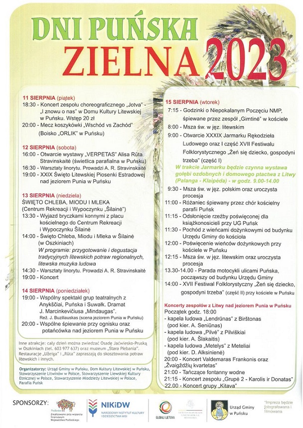 W tym roku "Dni Puńska - Zielna 2023“ potrwają aż pięć dni - od 11 do 15 sierpnia 2023r. W programie wiele imprez, atrakcji, w tym m.in. Odpust na Zielną, jarmark rękodzieła ludowego, podczas którego zaprezentują się rękodzielnicy, rzemieślnicy, twórcy ludowi, przedstawiciele dziedzictwa kulinarnego, imprezy muzyczne dla młodego i starszego pokolenia.