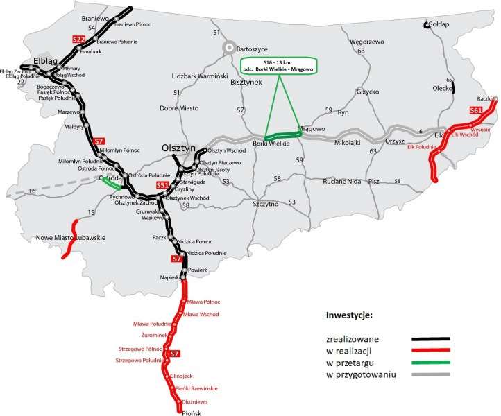 Na razie, w piątek,15.11.2019r., otwarte zostały oferty w ponownym przetargu na projekt i budowę drogi ekspresowej S16 Borki Wielkie - Mrągowo. O realizację zadania ubiega się siedmiu wykonawców. Najniższą cenę 619,5 mln zł zaproponowała firma Polbud-Pomorze Sp. z o.o., a najwyższą 869,6 mln zł firma Polaqua Sp. z o.o. Kosztorys GDDKiA to ok. 616,6 mln zł. Kolejnym etapem będzie weryfikacja złożonych ofert.