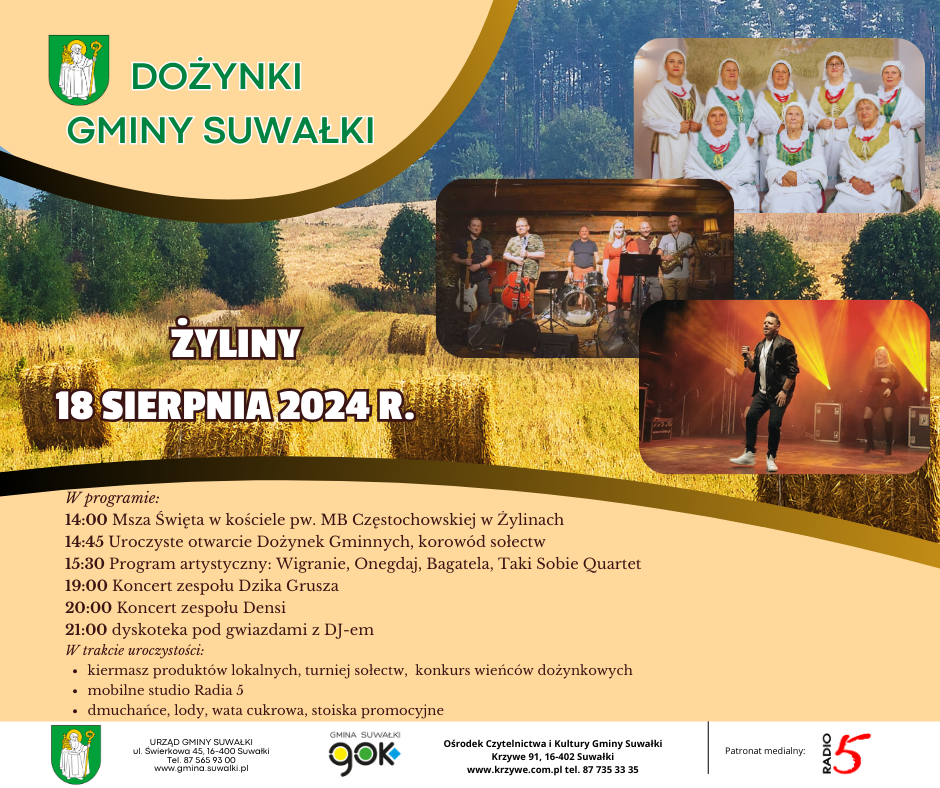 Urząd Gminy Suwałki oraz Ośrodek Czytelnictwa i Kultury Gminy Suwałki zapraszają na Dożynki Gminy Suwałki, które odbędą się w niedzielę, 18 sierpnia w Żylinach. Rozpoczęcie Mszą świętą o godzinie 14.00.