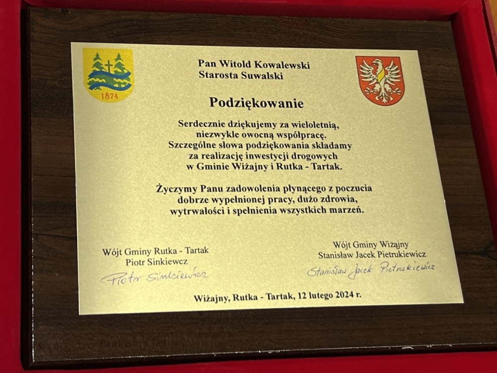 Podczas uroczystości starosta Witold Kowalewski otrzymał z rąk wójtów gmin Wiżajny, Jacka Pietrukiewicza i Rutka-Tartak, Piotra Sinkiewicza podziękowania za wieloletnią dobrą współpracę.